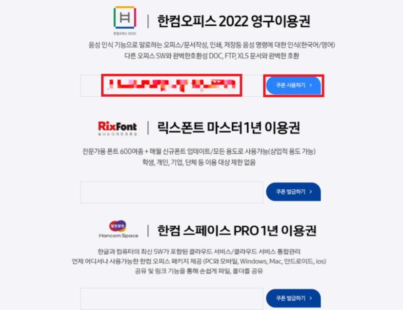 그다음 "쿠폰 발급하기"를 클릭하면 시리얼 넘버가 뜨고 "쿠폰 사용하기"를 클릭해줍니다.