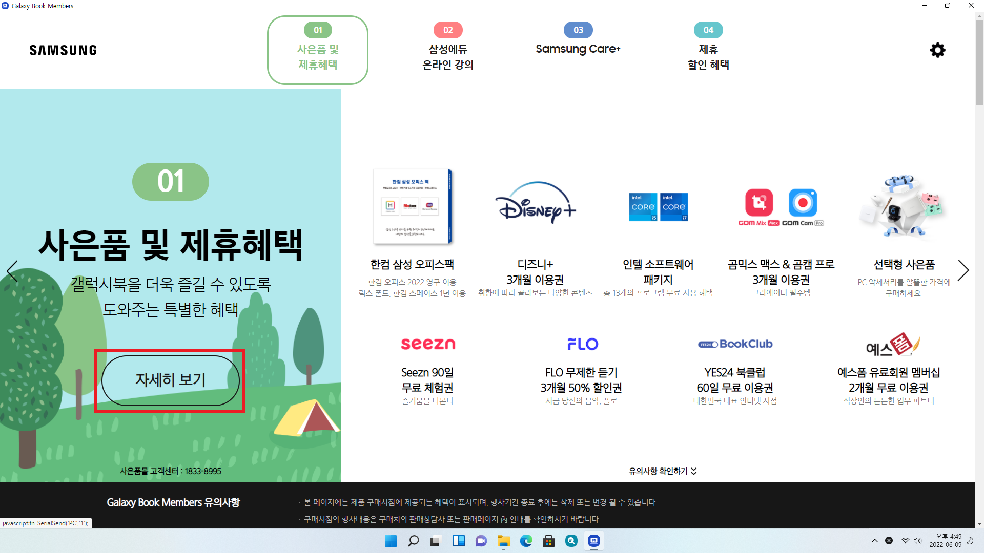 그다음 "시작하기"를 클릭하면 해당 제품 혜택 관련된 내용이 뜹니다. 한컴오피스 다운로드 관련은 사은품 및 제휴 혜택에 있으니 사은품 및 제휴 혜택란에서 "자세히 보기"를 클릭해줍니다.