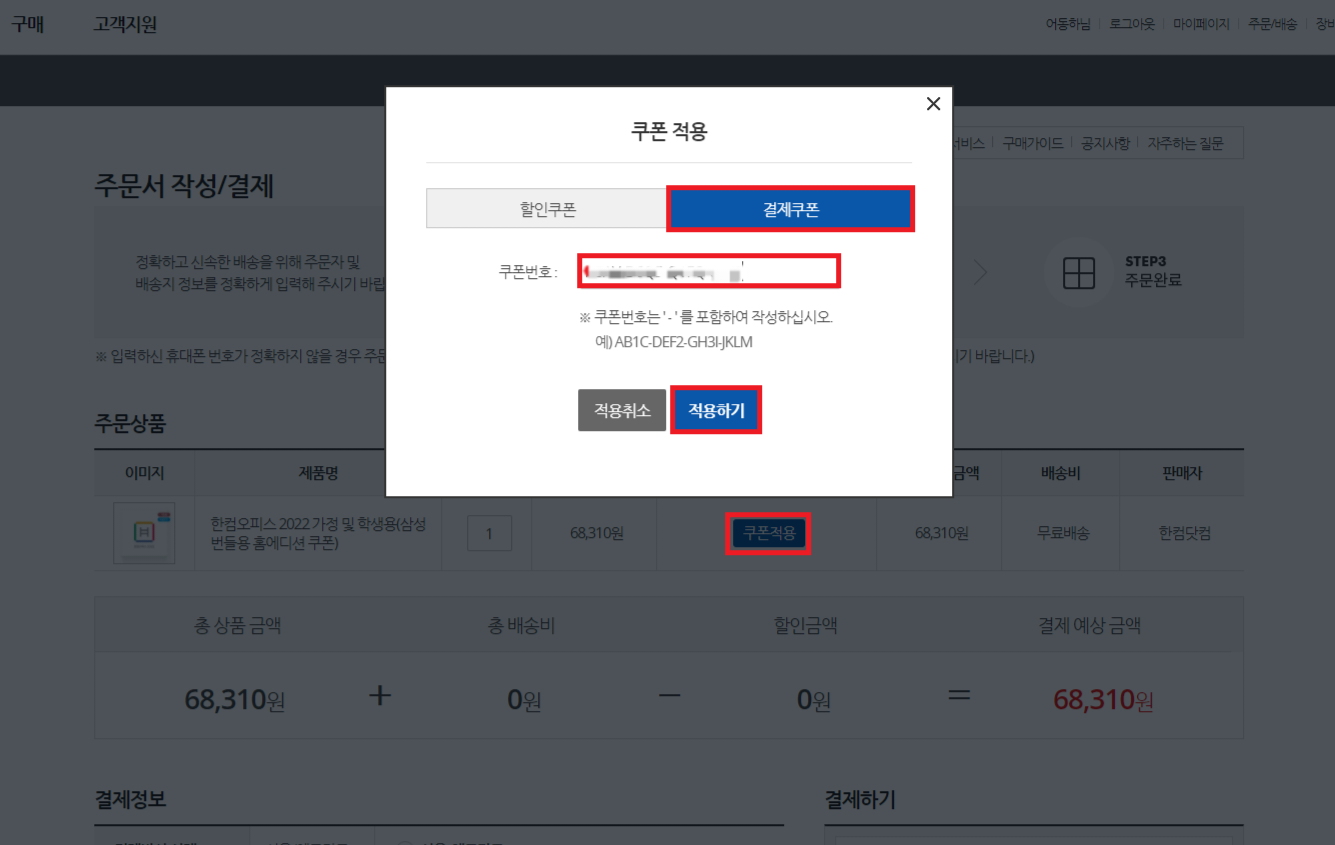 제가 알려드린 대로 한컴 사이트에 로그인했다면 해당 이미지처럼 넘어가 졌을 겁니다. 그럼 스크롤을 밑으로 내려서 "한컴오피스 2022 가정 및 학생용" "구매하기"를 클릭해줍니다. 그다음 1. 쿠폰 적용 클릭 - 2. 결제 쿠폰 클릭 - 3. 아까 복사한 쿠폰 번호 16자리 등록 - 4. 적용하기를 클릭해주면 됩니다.