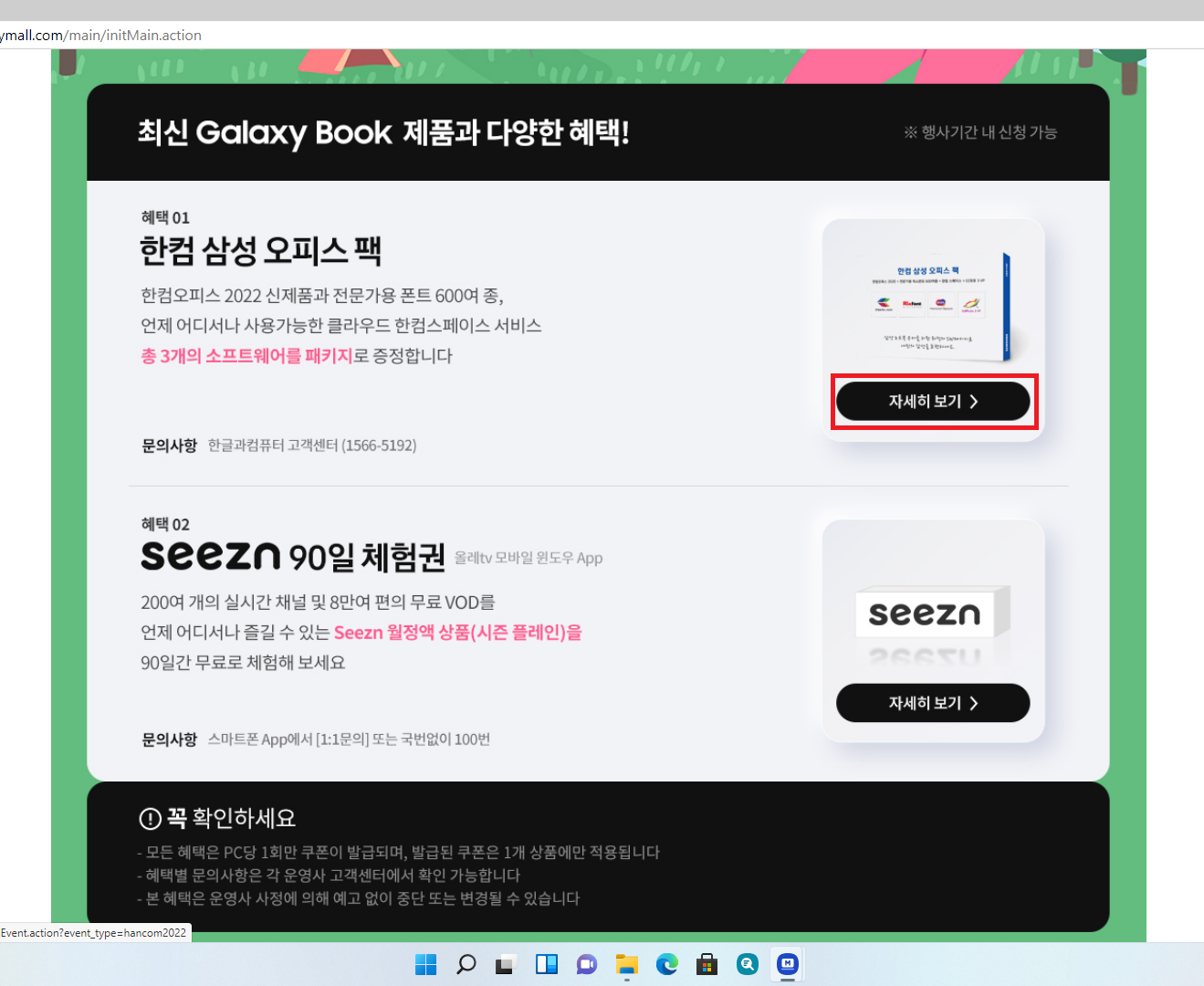 그다음 이용약관 동의하고 개인 정보 입력하고 가입을 하면 한컴 삼성 오피스 팩이 보일 겁니다. 그럼 한컴 삼성 오피스 팩 "자세히 보기"를 클릭해줍니다.