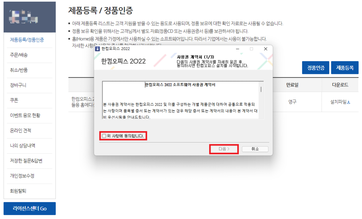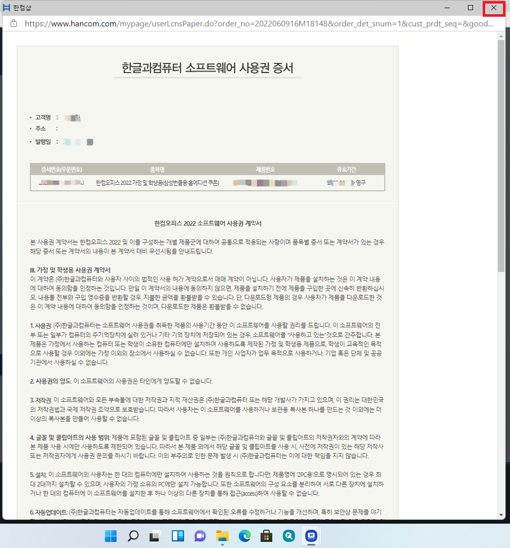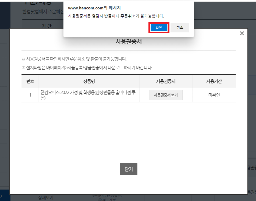 그럼 "사용권 증서를 알람 시 반품이나 주문 취소가 불가능합니다."라는 알람 뜨는데 당황하지 마시고 "확인"을 클릭하면 한글과 컴퓨터 소프트웨어 사용권 증서가 뜨는데 그냥" X " 버튼 눌러서 창을 나가주면 됩니다.
