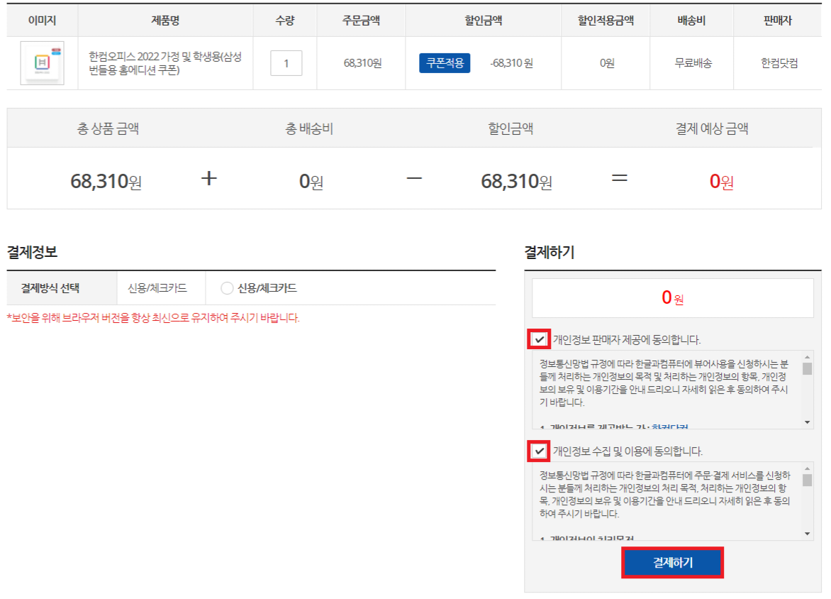 그럼 해당 68,310원 한컴오피스 2022를 0원에 구매할 수 있습니다. 그럼 "결제하기"를 클릭해보겠습니다.