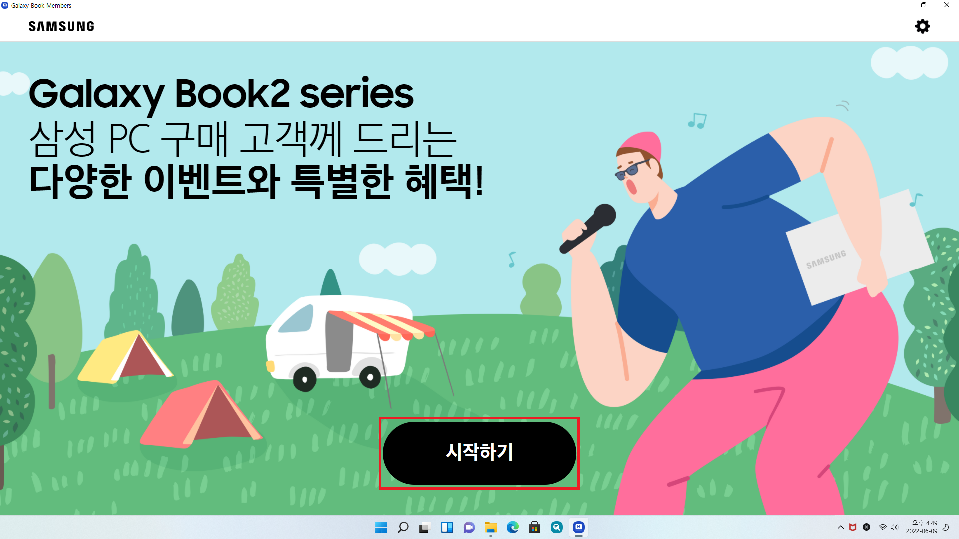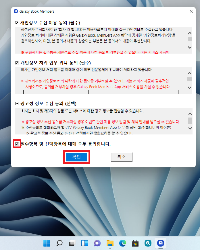윈도우 검색창에 영어로 "Galay Book Memders"라고 작성하고 갤럭시 북 멤버스 앱을 실행하면 개인정보 동의란이 뜹니다. 그럼 "필수항목 및 선택항목에 대해 모두 동의합니다"라는 체크란에 체크 후 확인 버튼을 클릭해줍니다.