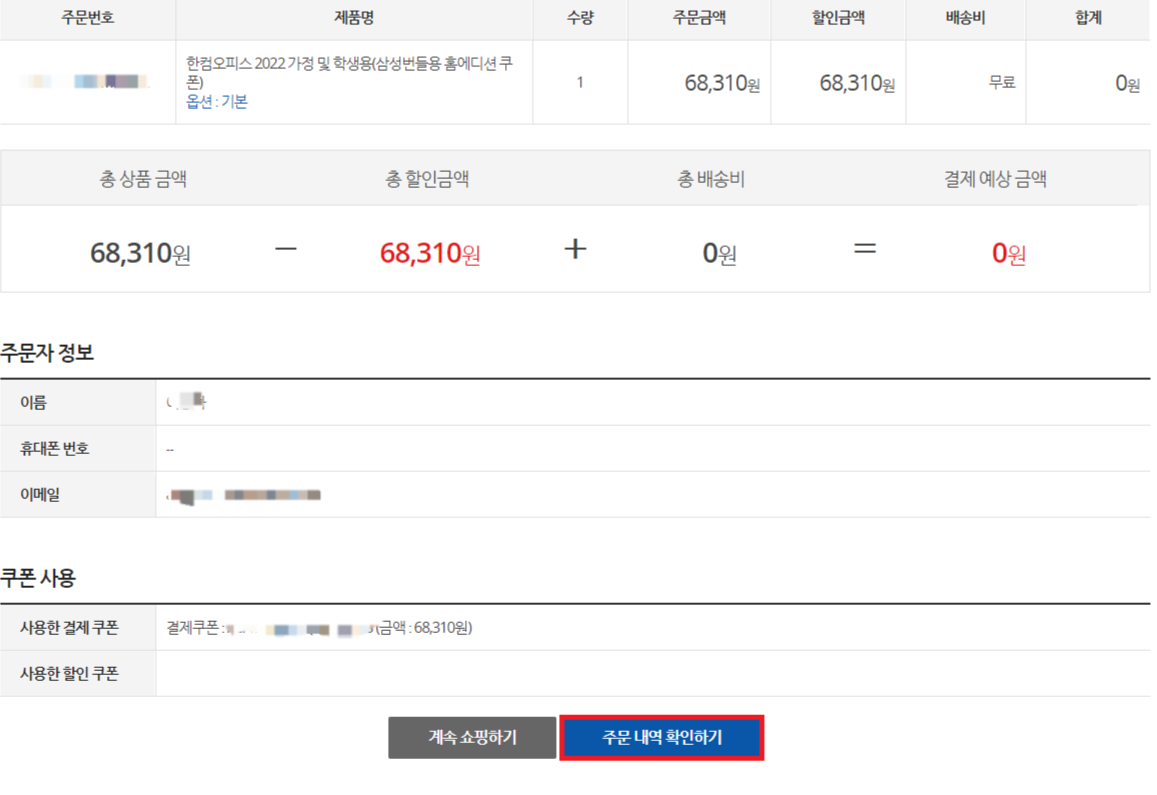 그럼 해당 68,310원 한컴오피스 2022를 0원에 구매할 수 있습니다. 그럼 "결제하기"를 클릭해보겠습니다.