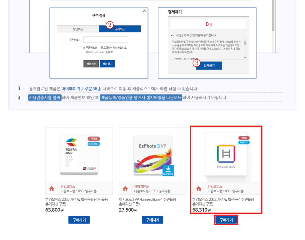 제가 알려드린 대로 한컴 사이트에 로그인했다면 해당 이미지처럼 넘어가 졌을 겁니다. 그럼 스크롤을 밑으로 내려서 "한컴오피스 2022 가정 및 학생용" "구매하기"를 클릭해줍니다. 그다음 1. 쿠폰 적용 클릭 - 2. 결제 쿠폰 클릭 - 3. 아까 복사한 쿠폰 번호 16자리 등록 - 4. 적용하기를 클릭해주면 됩니다.