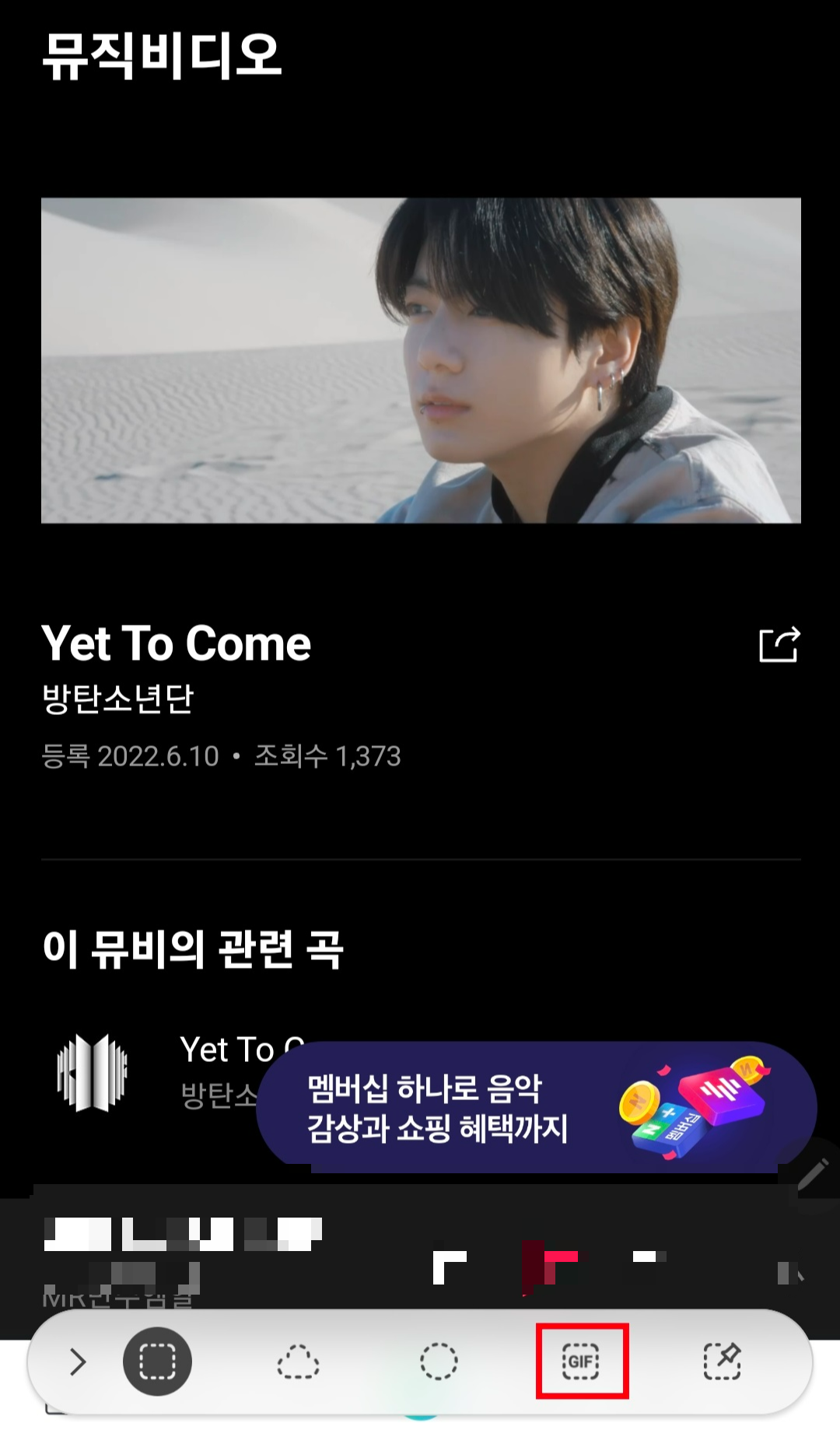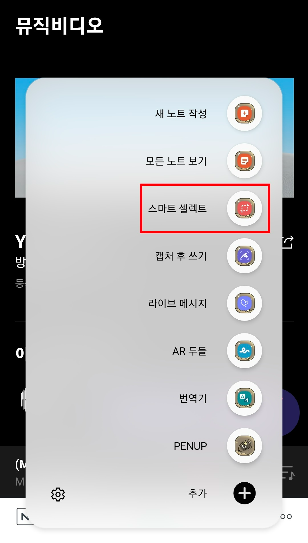 이와 같이 좋아하는 연예인이나 동물, 애니메이션 영상을 보고 있는데 GIF 영상으로 만들고 싶다면 S Pen 기능을 활성화시킨 후 [스마트 셀렉트]를 클릭한 다음 하단에 [GIF] 기능을 활성화시켜줍니다.