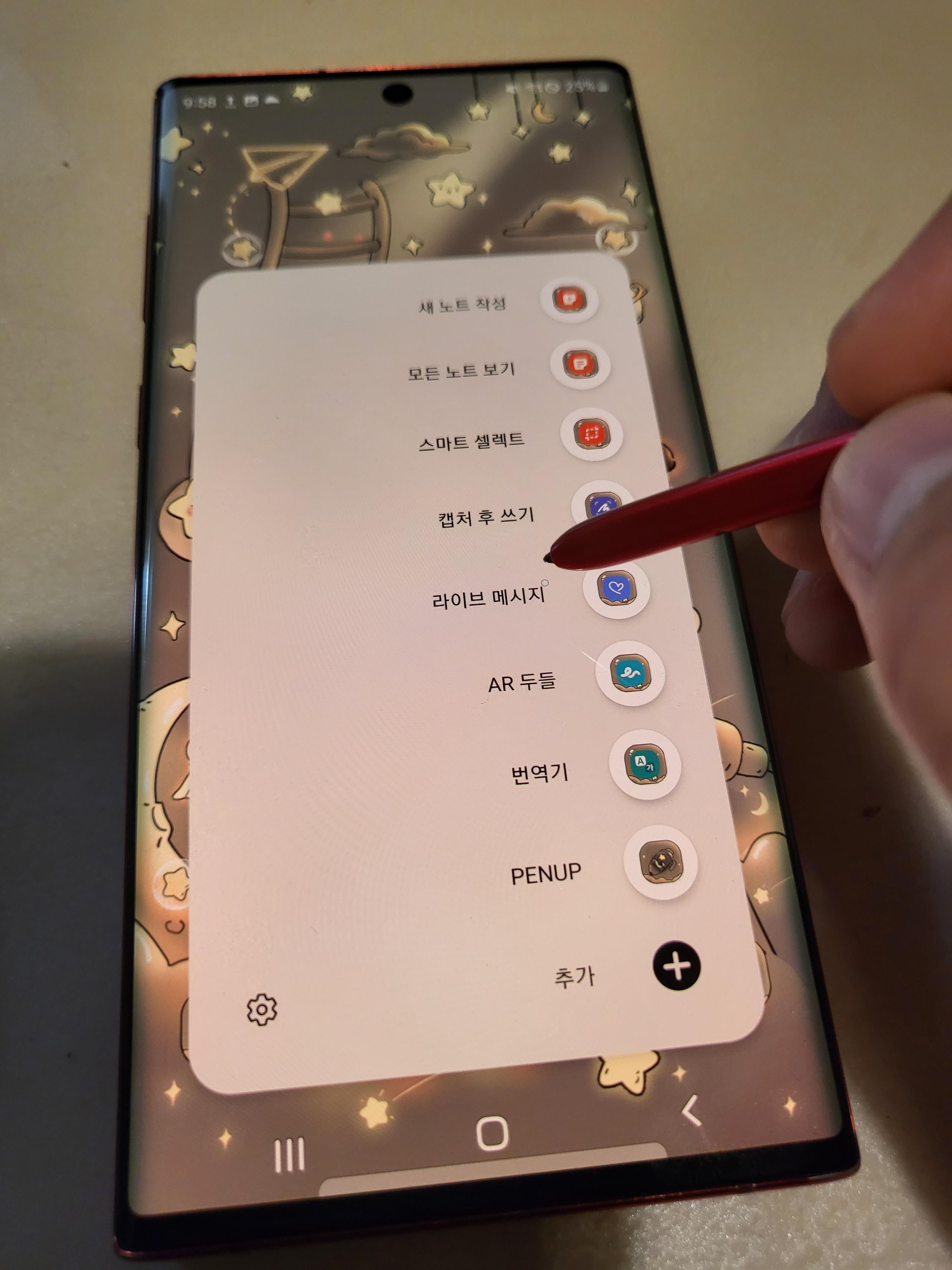 스마트폰이나 갤럭시 탭 화면에 S Pen를 가져다 대고 가운데 버튼을 클릭하면 다양한 기능이 쭉 뜨는 걸 확인할 수 있습니다.