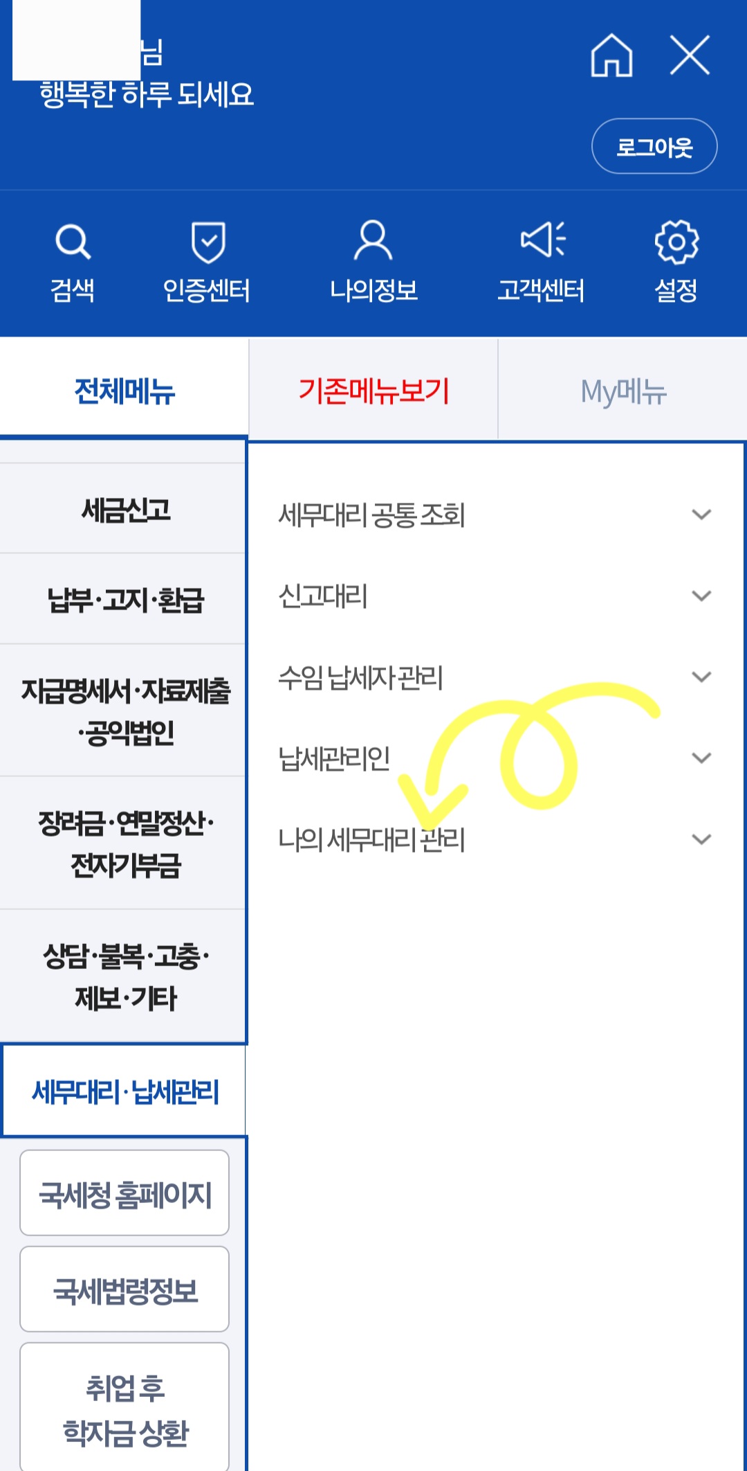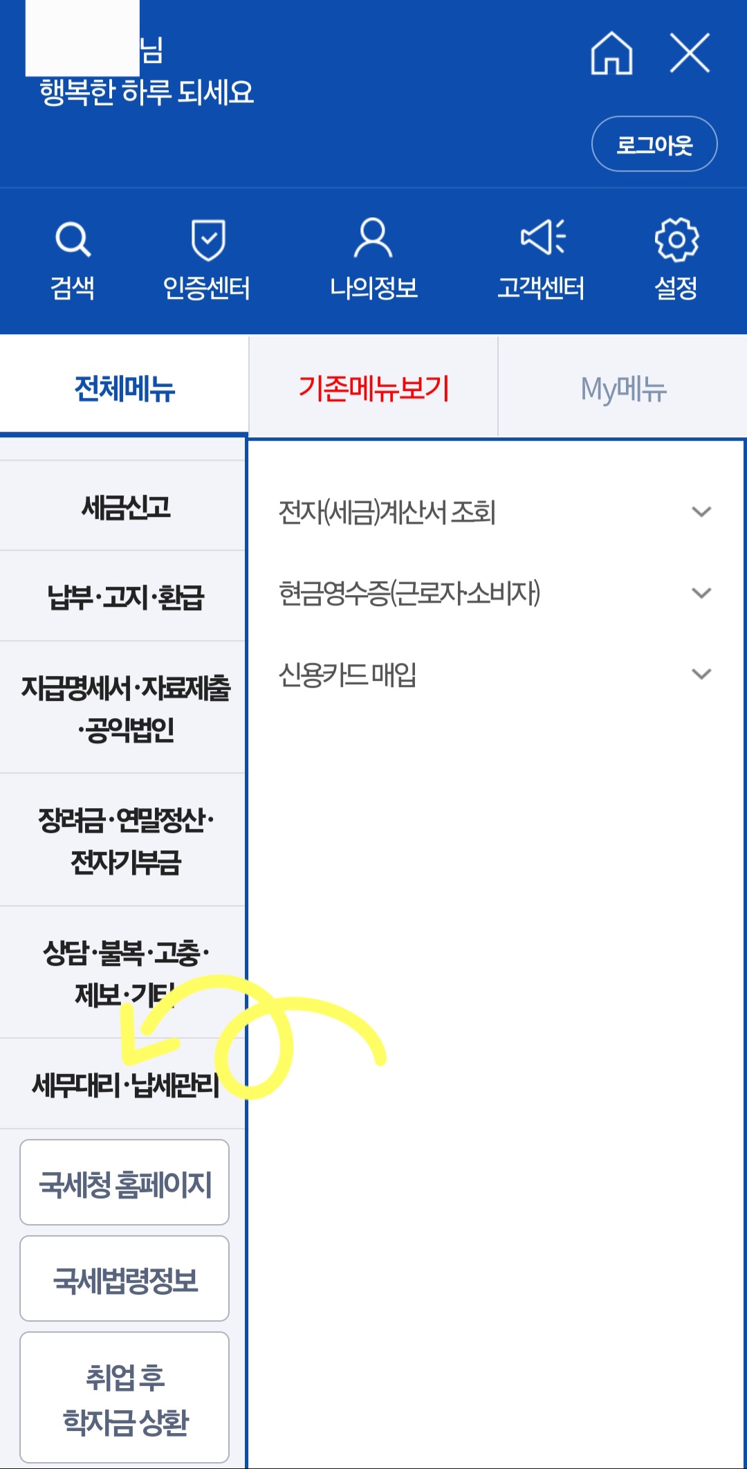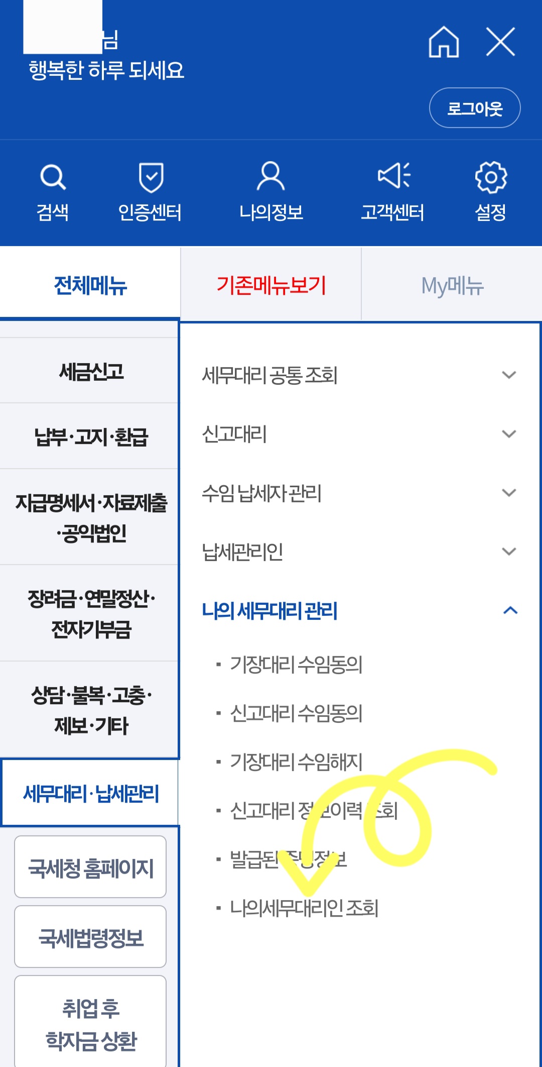 ▼그다음 왼쪽 전체메뉴에서 [세무대리•납세관리]를 클릭 후 [나의 세무대리 관리] 및 [나의 세무대리인 조회]를 클릭해 줍니다.
