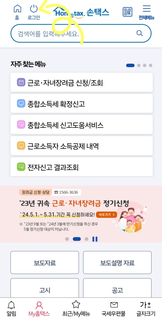 ▼세무 대리인을 해지하려면 국세청 손택스앱을 다운로드 후 [로그인]을 해주세요. 그다음 상단 오른쪽 [전체메뉴]를 클릭해 줍니다. *컴퓨터로도 가능합니다.