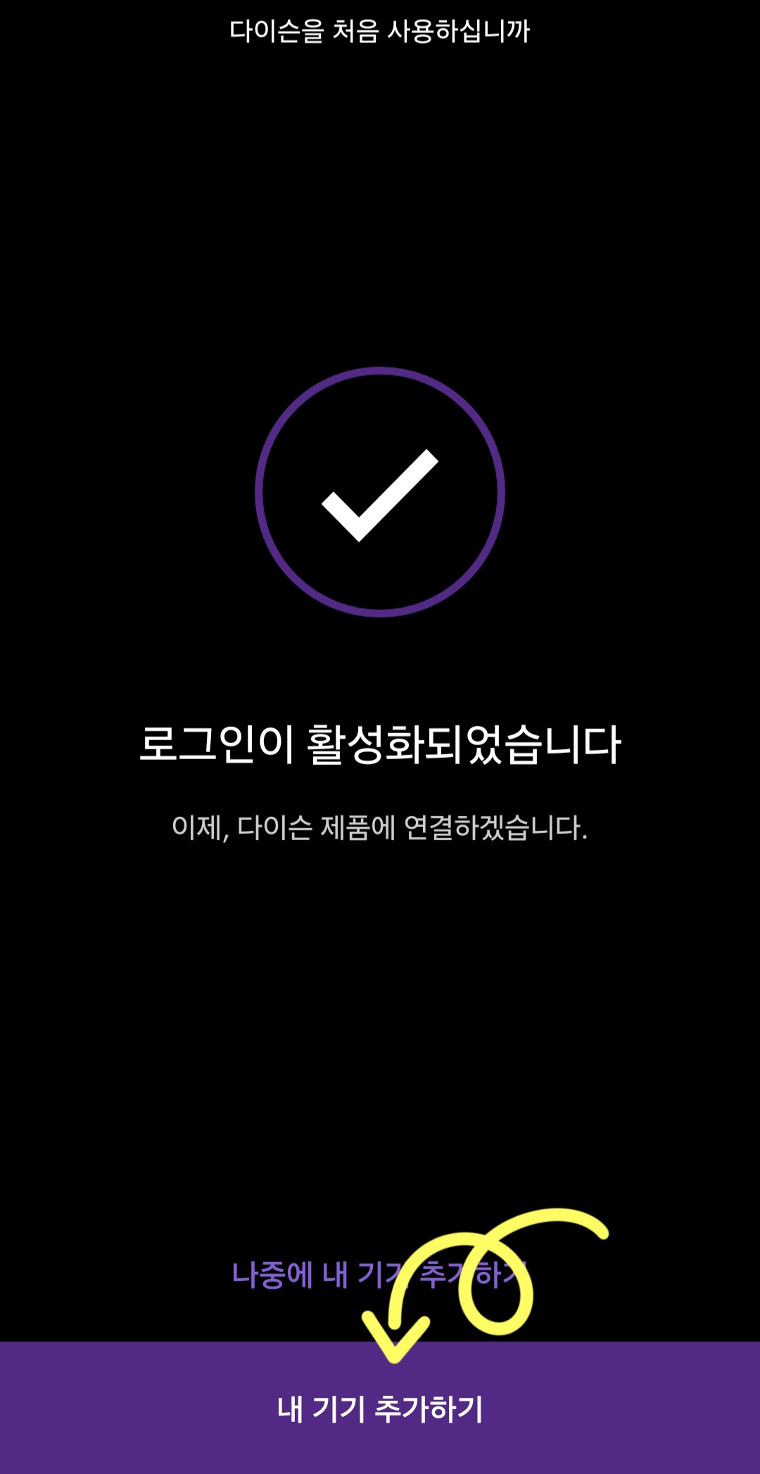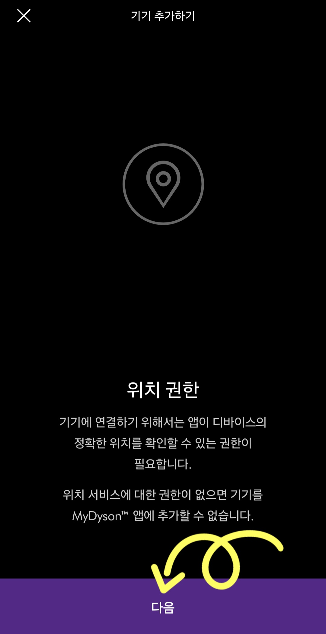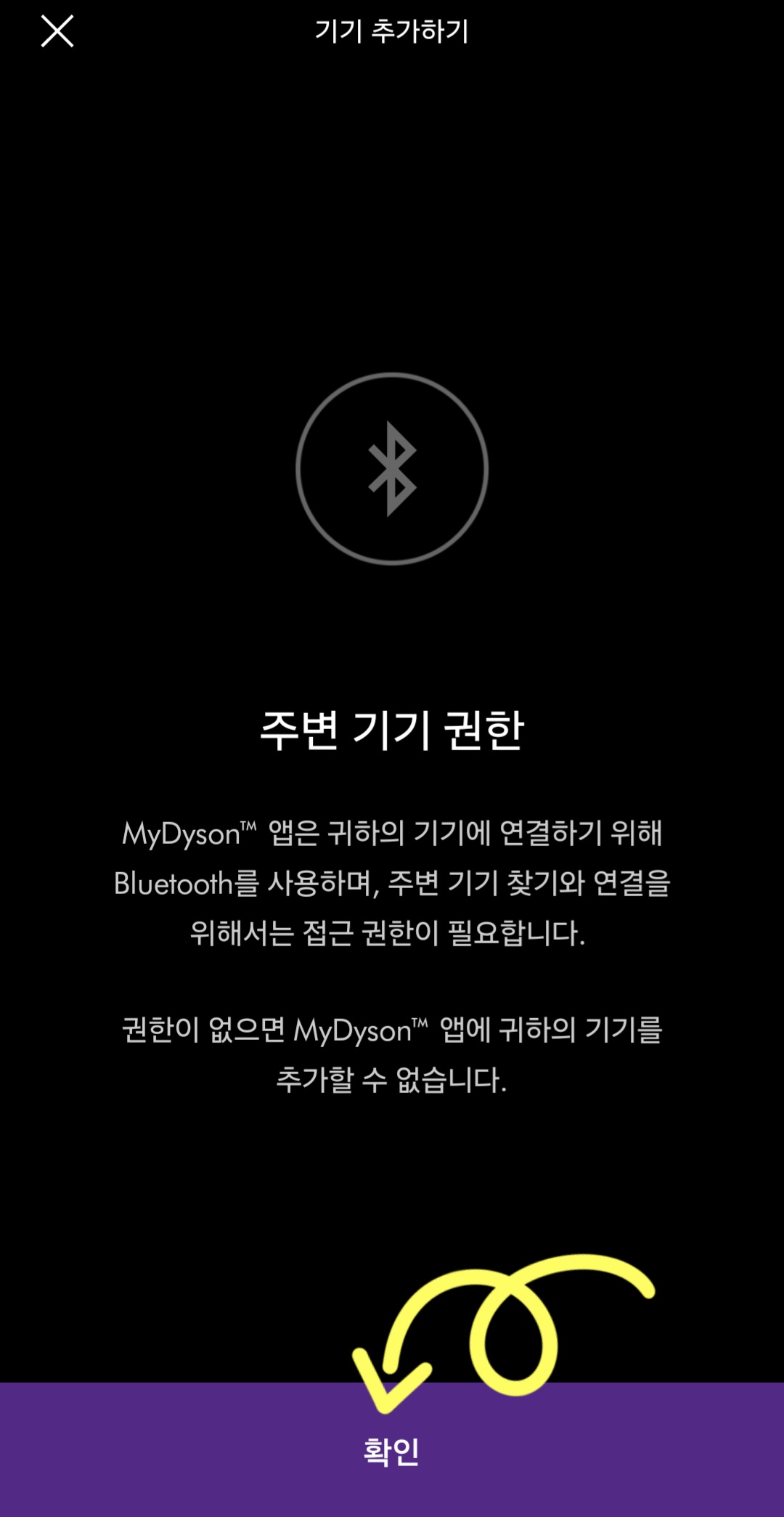 ▼다음으로 사용 중인 다이슨 기기를 등록해야겠죠. [내 기기 추가하기] 클릭하고 주변 기기 권한 및 위치 권한을 확인해 주세요.