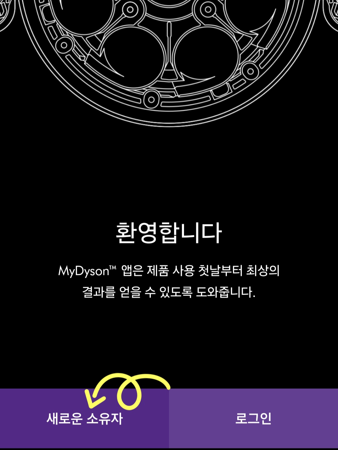 ▼우선 플레이 스토어에서 [MyDyson] 앱을 다운로드 후 실행해 줍니다. 그다음 로그인을 해줘야겠죠. 하단에 있는 [새로운 소유자]를 클릭해 줍니다.