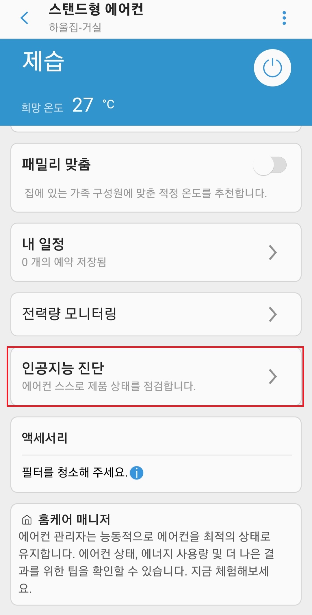 인공지능 진단 기능을 사용하기 위해선 우선 사용 중인 삼성 에어컨을 스마트싱스 앱에 미리 연동해 놓아야 합니다.