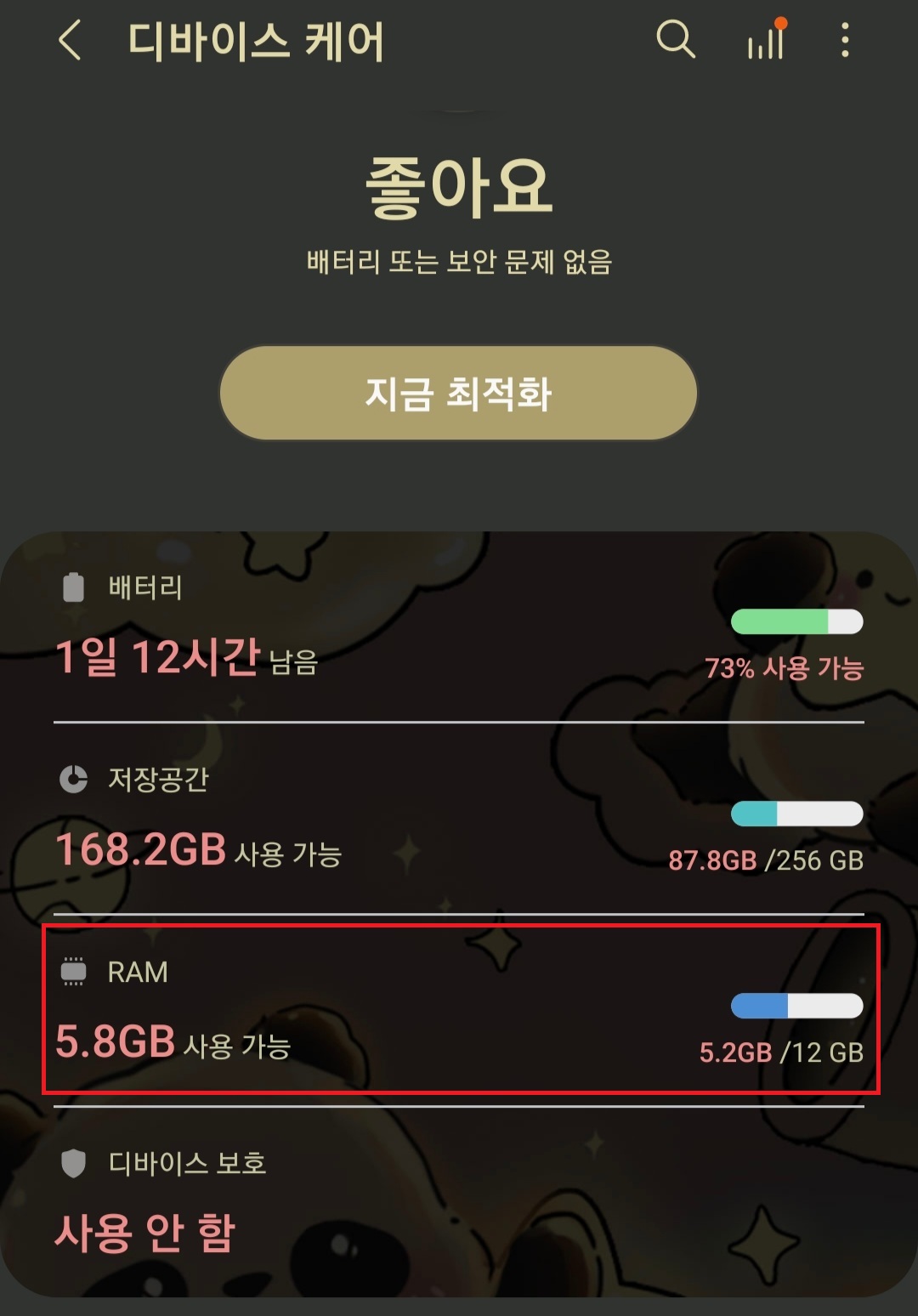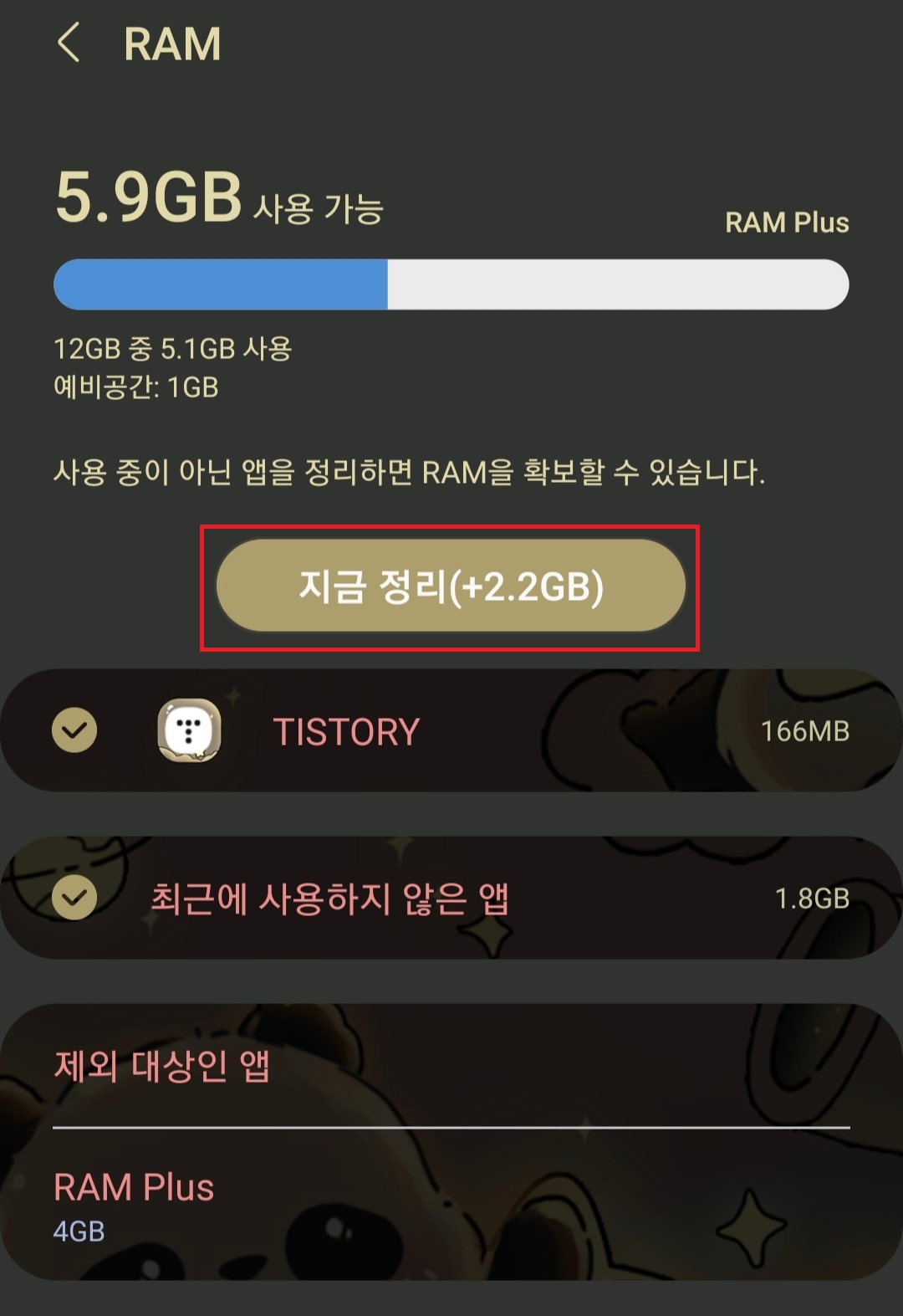 혹은 지금 정리 버튼을 누르면 사용 중인 앱 혹은 최근에 사용하지 않은 앱까지 정리해주면서 램 공간을 늘려주는 좋은 기능입니다.