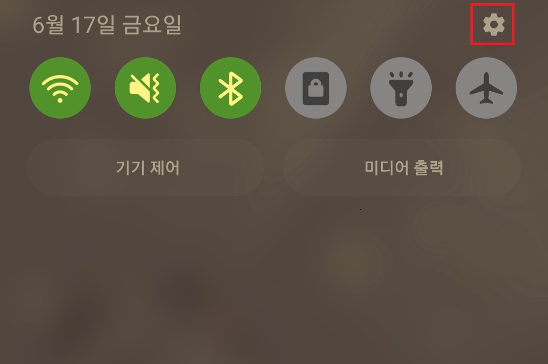 우선 스마트폰 화면을 손가락으로 위에서 아래로 내려 퀵패널을 활성화시킨 다음 톱니바퀴 모양(설정)을 클릭해줍니다.