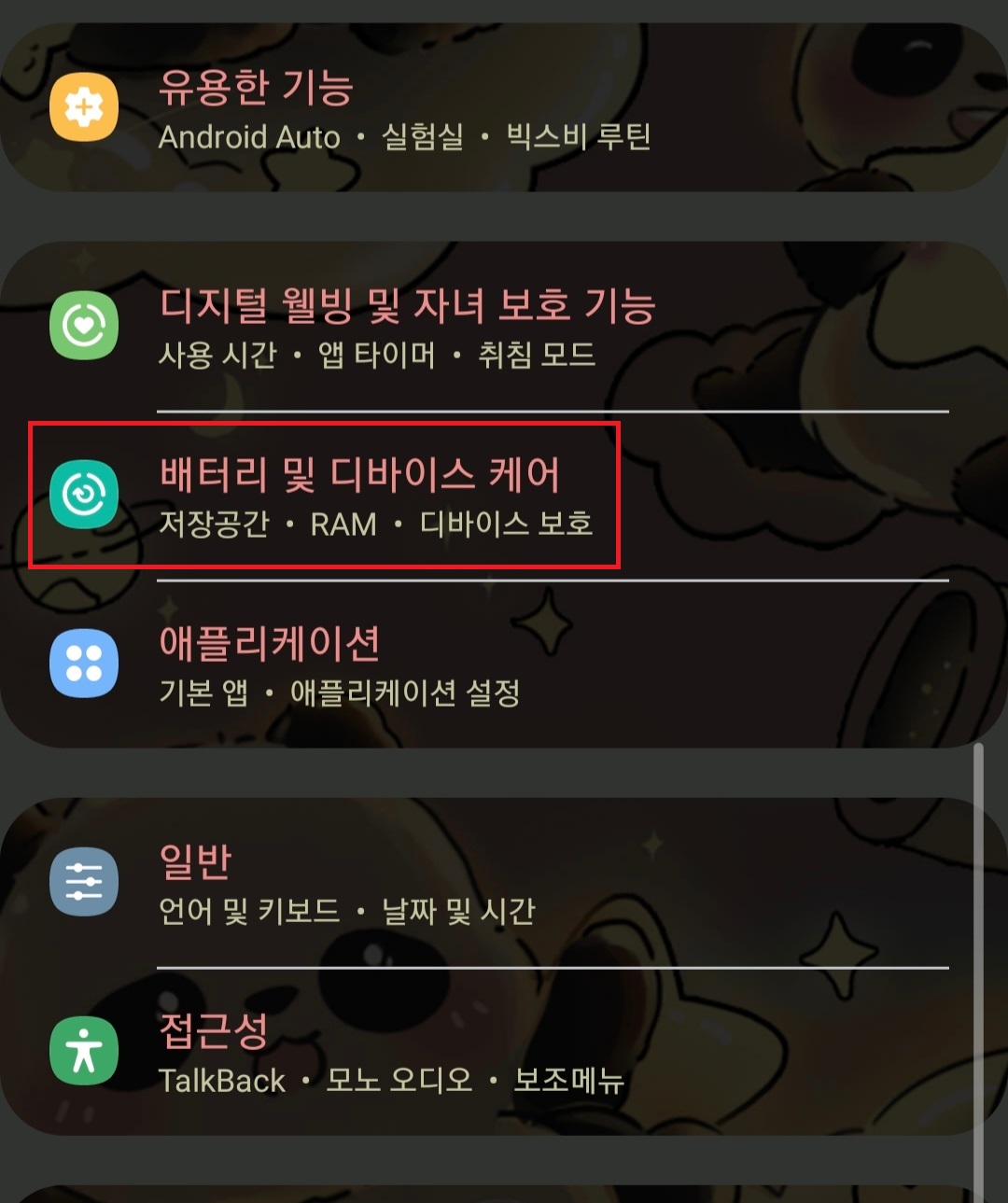 설정에 들어가서 밑으로 스크롤을 내리다 보면 "배터리 및 디바이스 케어"가 보일 겁니다. 그걸 클릭해줍니다.