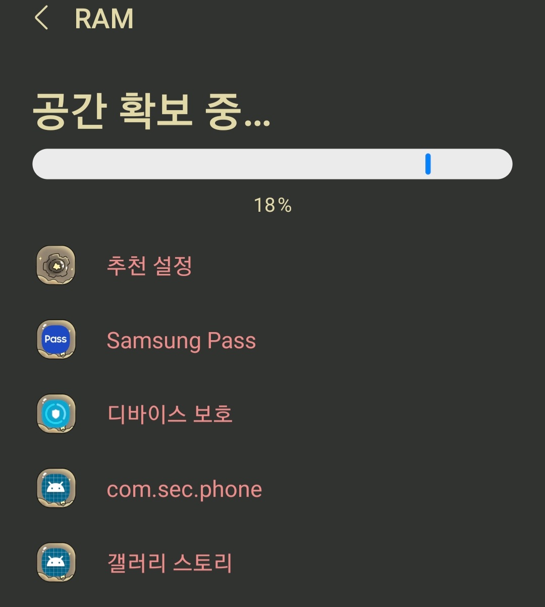 혹은 지금 정리 버튼을 누르면 사용 중인 앱 혹은 최근에 사용하지 않은 앱까지 정리해주면서 램 공간을 늘려주는 좋은 기능입니다.