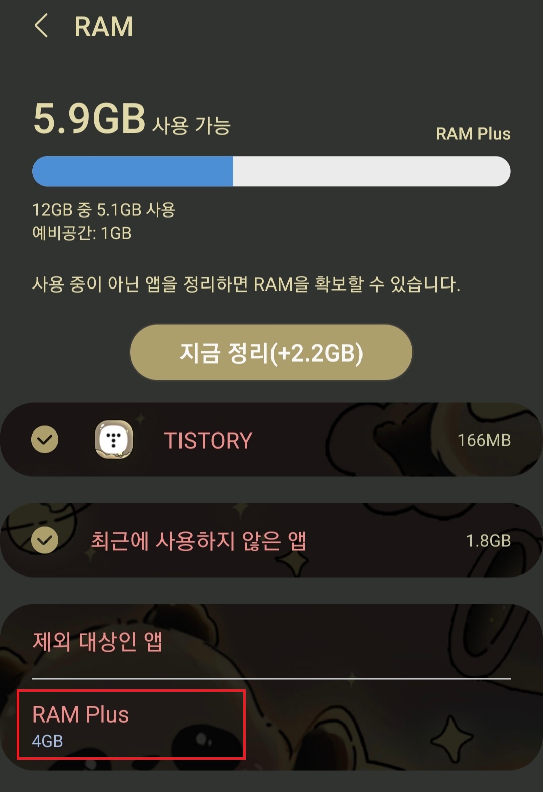 그럼 "RAM Plus"란으로 넘어가지고 램 관련해서 설정할 수가 있습니다. 우선 "RAM Plus"를 클릭해보겠습니다.