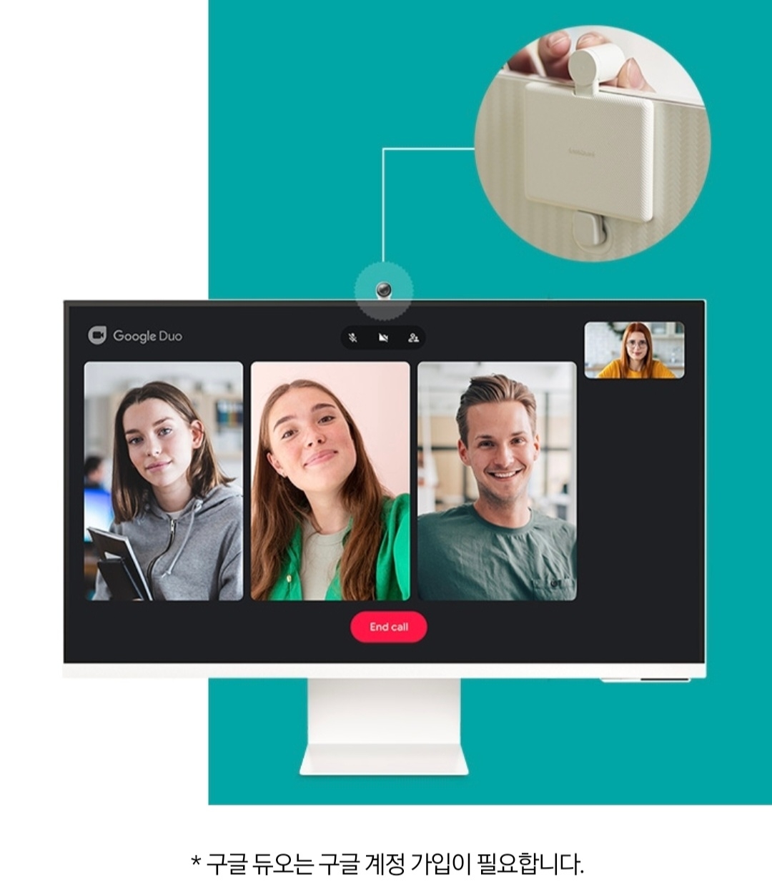 삼성 스마트 모니터 M5, M7에는 없었던 FHD 슬림핏 카메라(웹 카메라)가 삼성 스마트 모니터 M8 제품에는 기본적으로 제공되어 구글 듀오와 같은 영상통화 앱을 통해서 영상통화도 가능해졌고 슬림핏 카메라로 삼성 헬스 앱을 이용해 홈트레이닝도 가능해졌습니다. 슬림핏 카메라는 마그네틱 부착방식으로 슬림핏 카메라를 사용 안 할시 탈부착이 가능해 별도로 보관할 수도 있고 혹은 카메라 커버도 제공하기 때문에 사생활 보호 또한 할 수 있습니다
