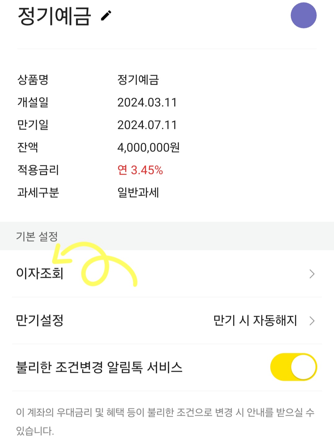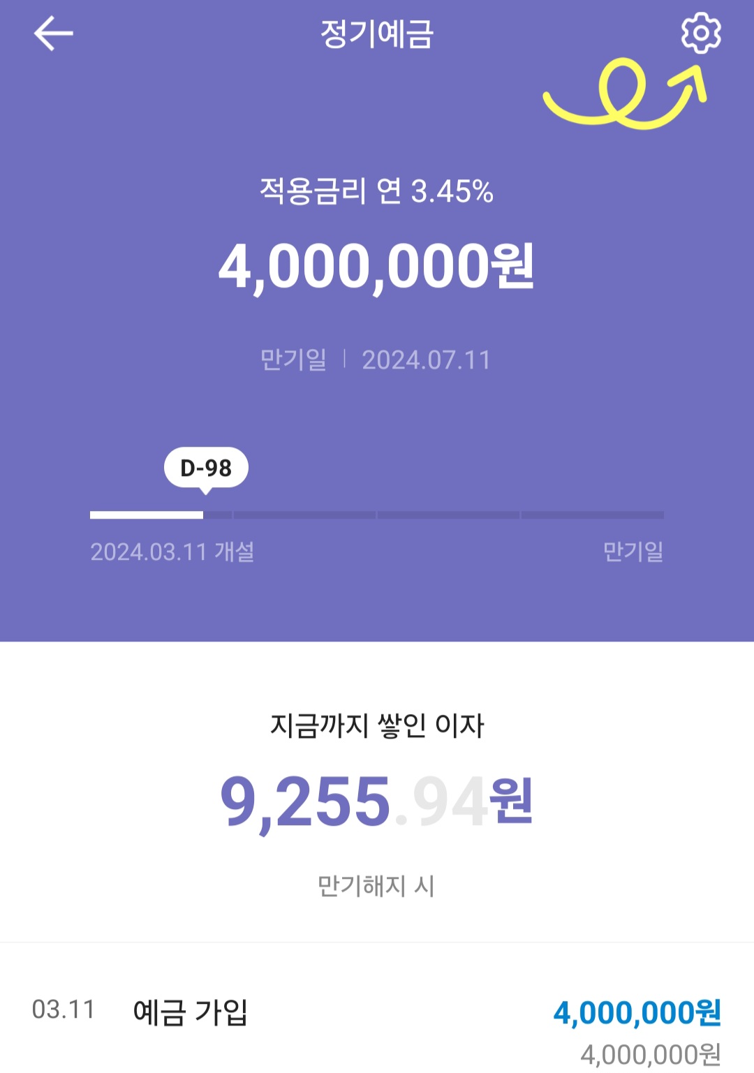 ▼쌓여있는 이자 금액을 확인하는 거 외에도 해지 및 만기일 때 받는 금액도 확인할 수 있는데요. [설정(톱니바퀴모양)]을 클릭 후 이자 조회 클릭하면 볼 수 있습니다.