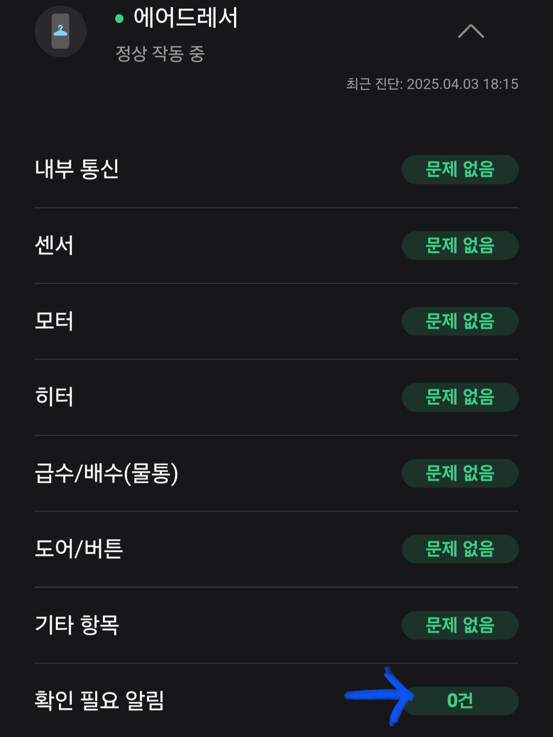 ▼그다음 에어드레서를 클릭하고 [확인 필요 알림]을 클릭한 뒤 [필터 사용량 초기화]를 클릭해 주면 끝!!