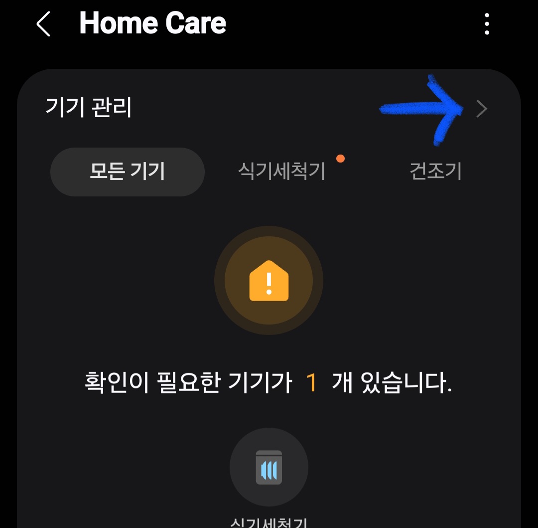 ▼스마트싱스를 실행 후 [Home Care]를 클릭한 다음 [기기 관리]를 클릭해 주세요.
