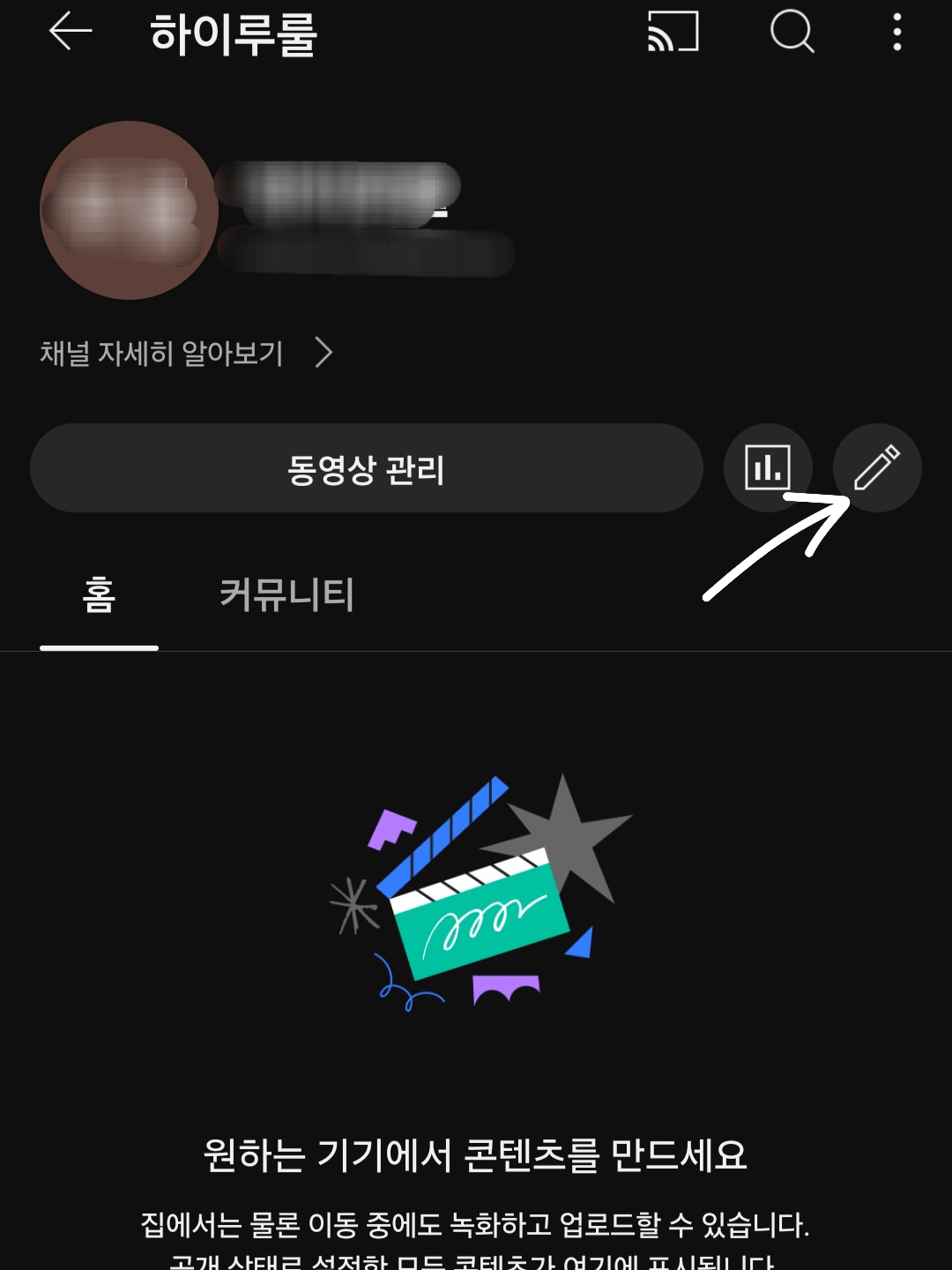 ▼그다음 "채널 보기"를 클릭 후 영상관리 바로 옆에 있는 "연필모양"을 클릭해 주세요.
