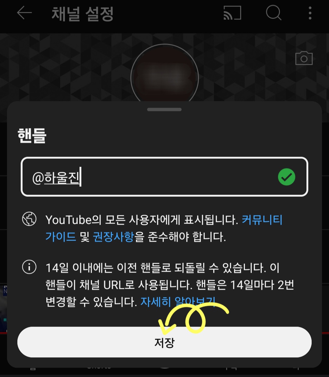 ▼그럼 이미지 사진 및 이름도 바꿀 수 있는데요. 댓글 아이디를 바꾸기 위해선 "핸들"라인에 있는 "연필모양"을 클릭하고 원하는 아이디를 입력 후 "저장"을 눌러주고 댓글을 달면 아이디가 바뀐 걸 확인할 수 있습니다.
