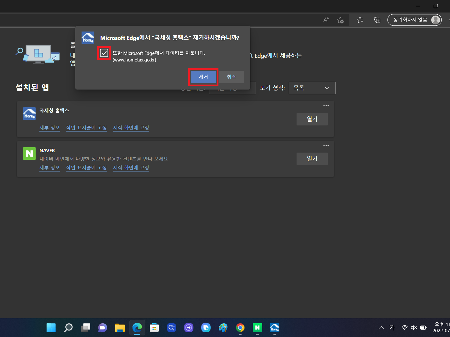 그다음 "또한 마이크로 엣지에서 데이터를 지웁니다"도 체크 후 제거하기를 클릭해주면 끝!