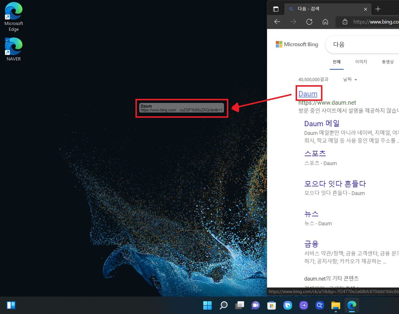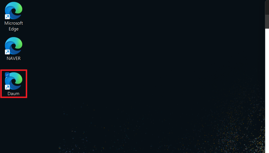 그럼 보시는 것처럼 네이버가 바탕화면에 아이콘으로 생성된 걸 보실 수 있습니다. 이번에 다음 사이트를 검색하고 동일하게 검색된 사이트를 마우스 좌측 버튼으로 꾹 누르고 바탕화면으로 드래그하면 됩니다. 그럼 다음 사이트도 아이콘으로 만들어진 걸 확인할 수 있습니다.