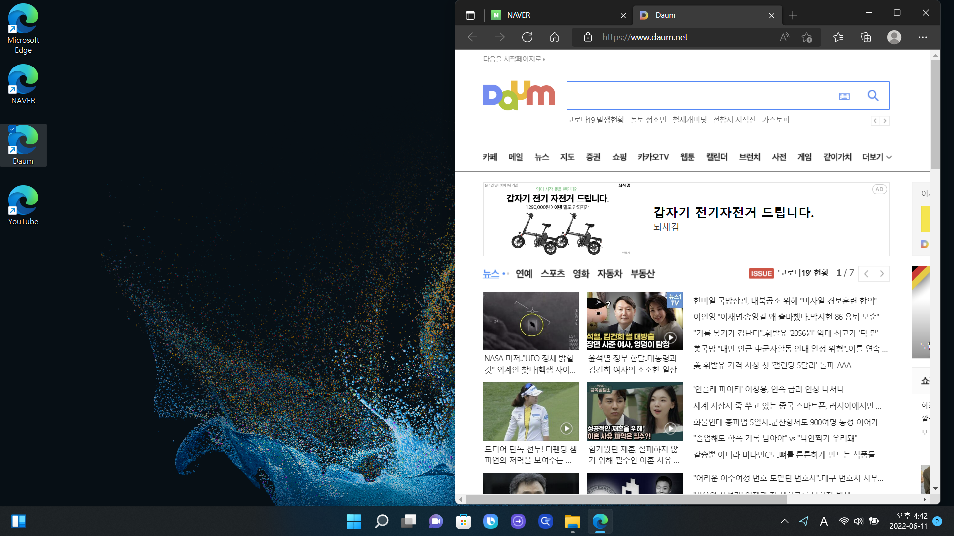 바탕화면에 만들어진 NAVER 아이콘 Daum 아이콘을 더블 클릭하면 보시는 것처럼 해당 사이트에 바로 접속이 됩니다. 정말 간단하죠??