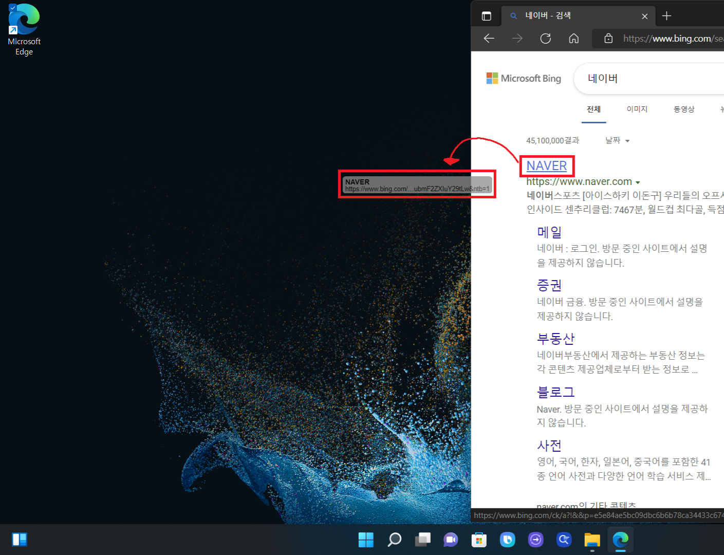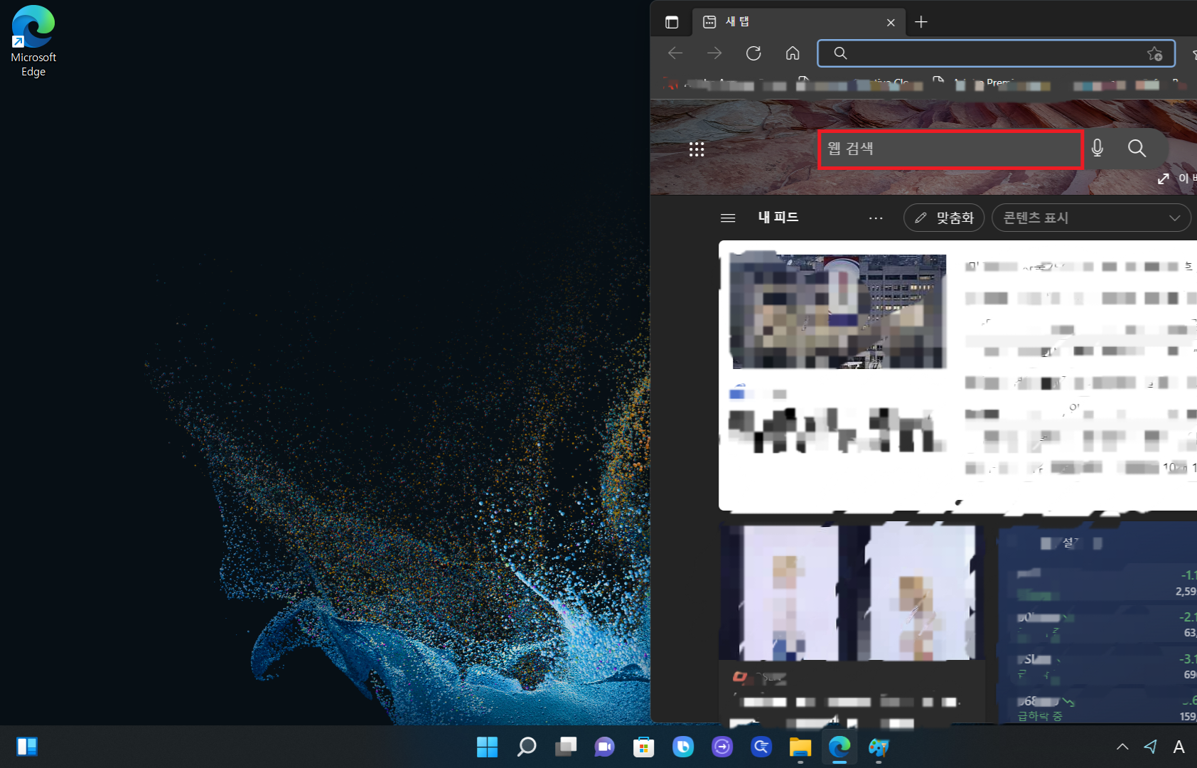 자주 접속하는 사이트를 바탕화면 아이콘으로 만드는 방법은 엣지나 크롬에서도 방식은 동일하기에 윈도우 기본 탑재되어있는 엣지로 설명해드리겠습니다. 마이크로소프트 엣지를 클릭하고 검색창에 자주 접속하는 사이트를 검색해줍니다.