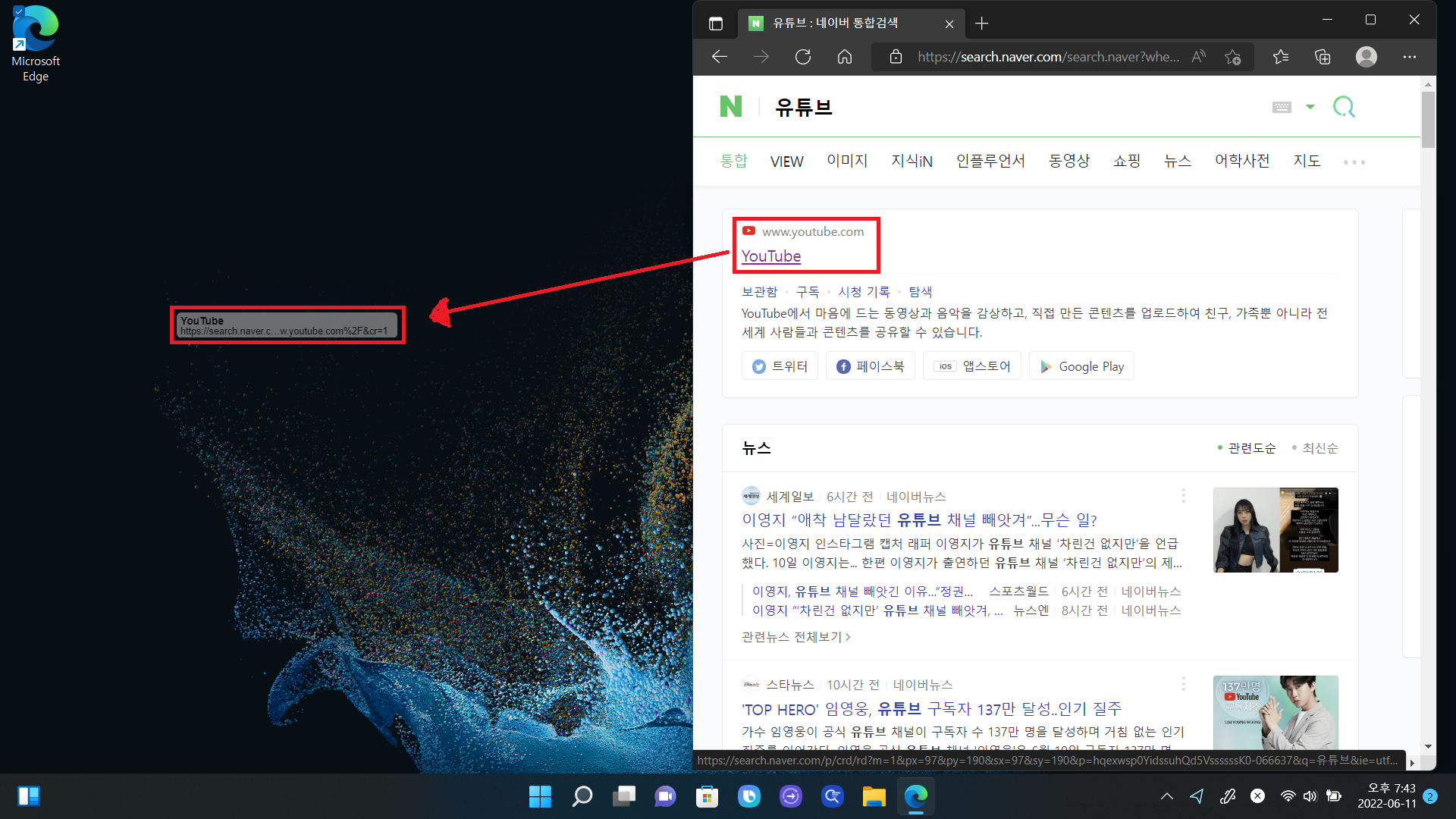 저는 네이버를 검색을 해보았고 바로 밑에 네이버 사이트를 마우스 좌측 버튼을 꾹 누른 상태에서 바탕화면으로 드래그됩니다.
