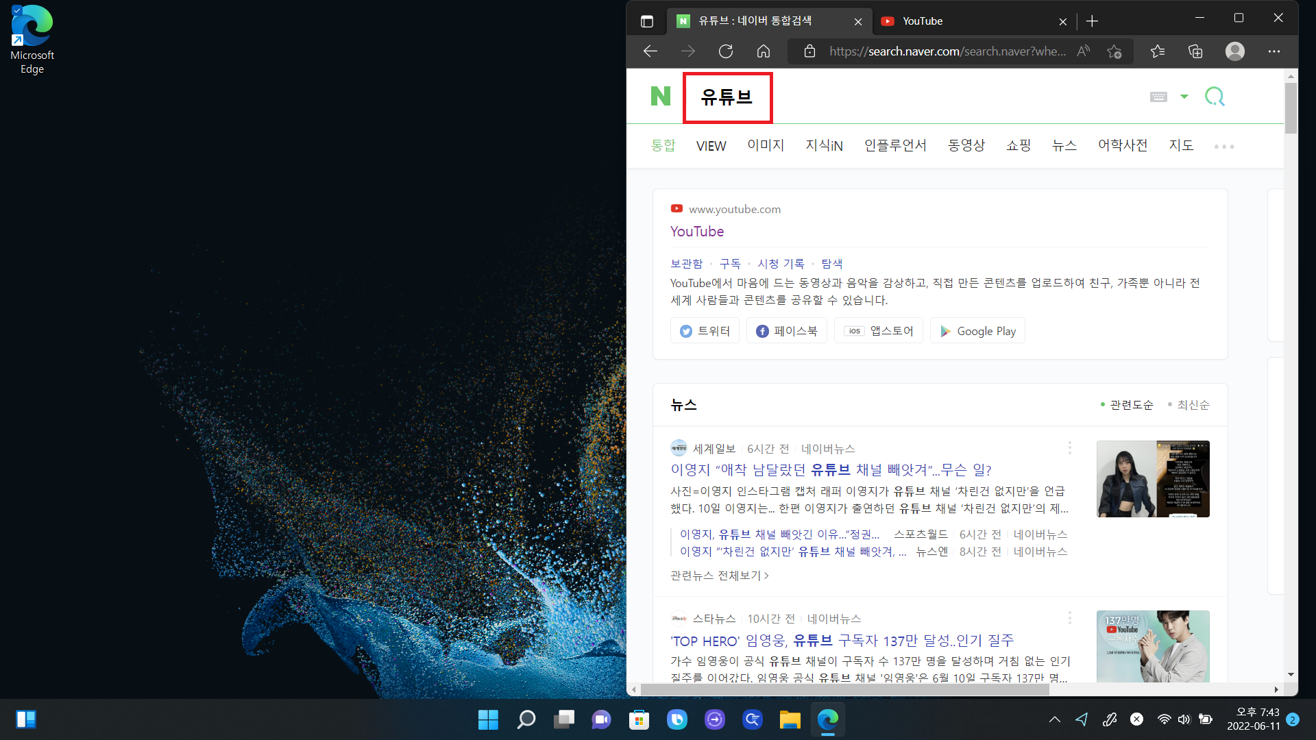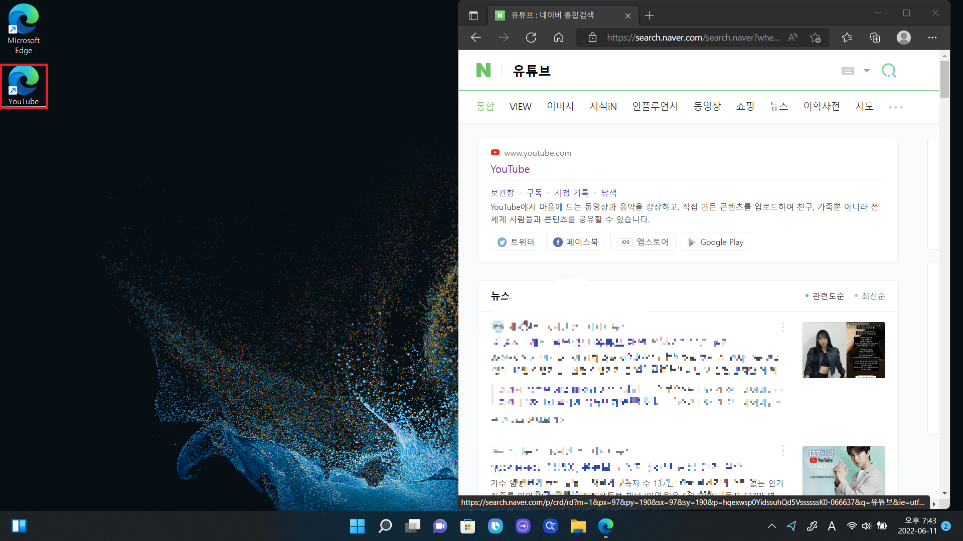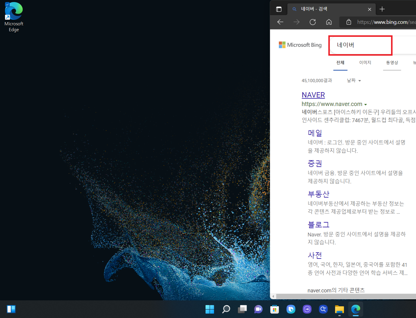 자주 접속하는 사이트를 바탕화면 아이콘으로 만드는 방법은 엣지나 크롬에서도 방식은 동일하기에 윈도우 기본 탑재되어있는 엣지로 설명해드리겠습니다. 마이크로소프트 엣지를 클릭하고 검색창에 자주 접속하는 사이트를 검색해줍니다.