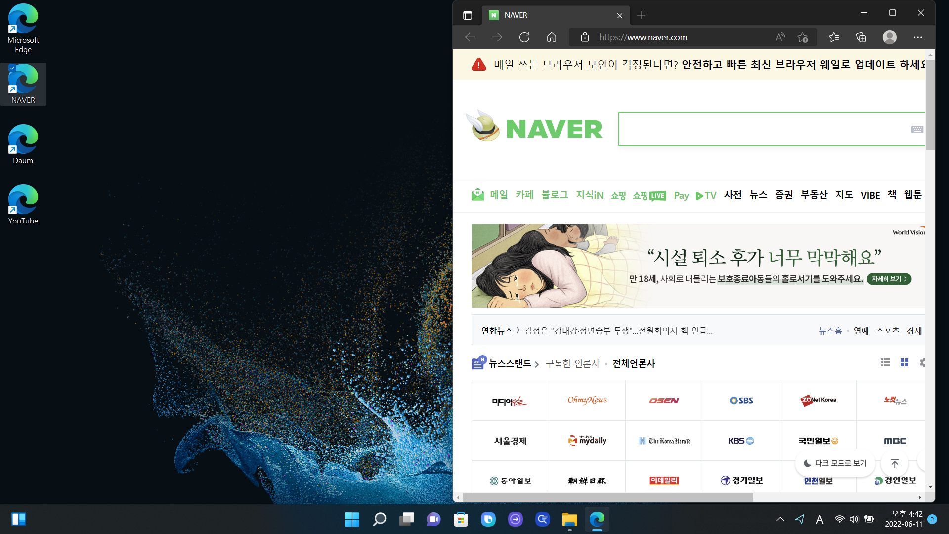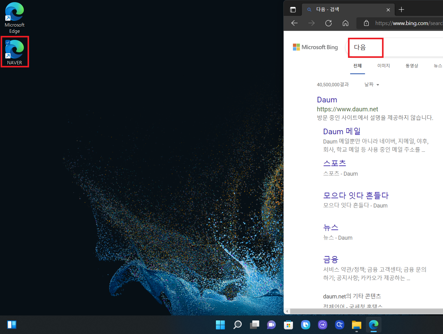바탕화면에 만들어진 NAVER 아이콘 Daum 아이콘을 더블 클릭하면 보시는 것처럼 해당 사이트에 바로 접속이 됩니다. 정말 간단하죠??