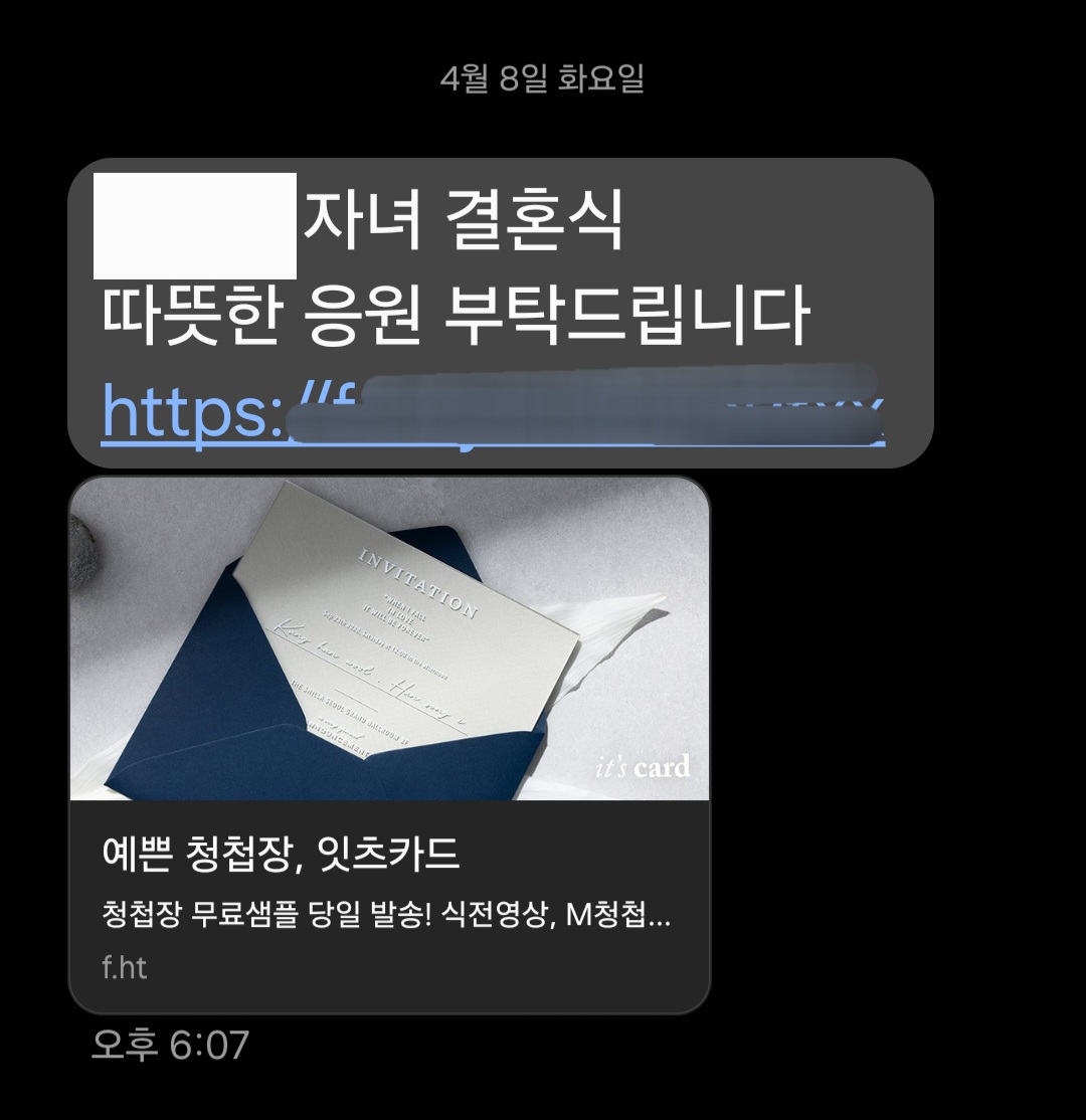 최근 "OOO자녀 결혼식에 따뜻한 응원 부탁드립니다"라는 문자가 날아왔는데요? 해당 링크를 클릭하니 데이터 손상이 갈수도 있다는 문구가 뜨더라고요. 곰곰이 생각해보니 해당 지인의 아이는 초등학생. 잘못하면 보이스피싱에 당할뻔했는데요.