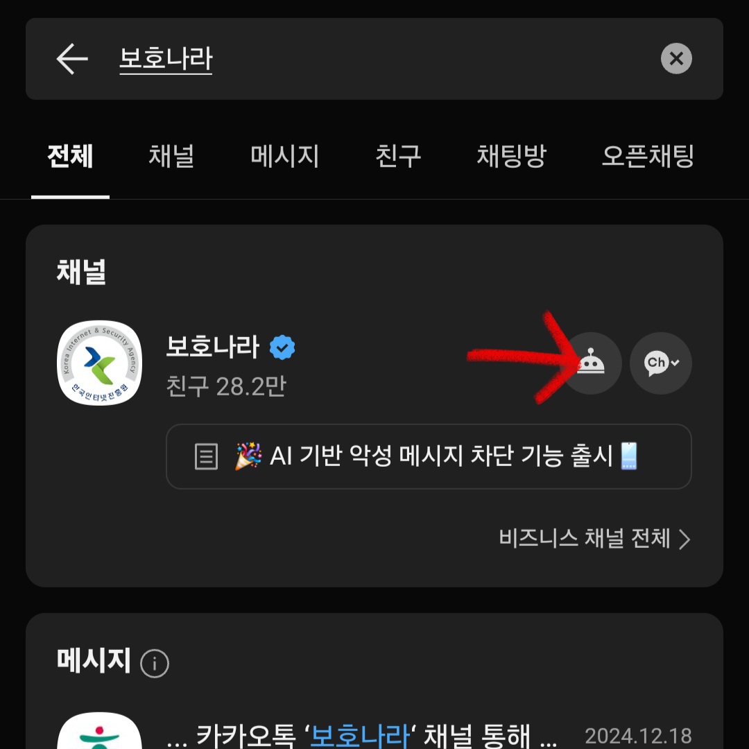 ▼그럼 밑에 보호나라 채널이 하나 뜨는데요. 그럼 바로 옆에 챗봇을 클릭해준 다음 해당 문자 링크를 복사해 입력을 하면 보이스피싱인지 아닌지 밑에 있는 이미지처럼 확인을 해준답니다.