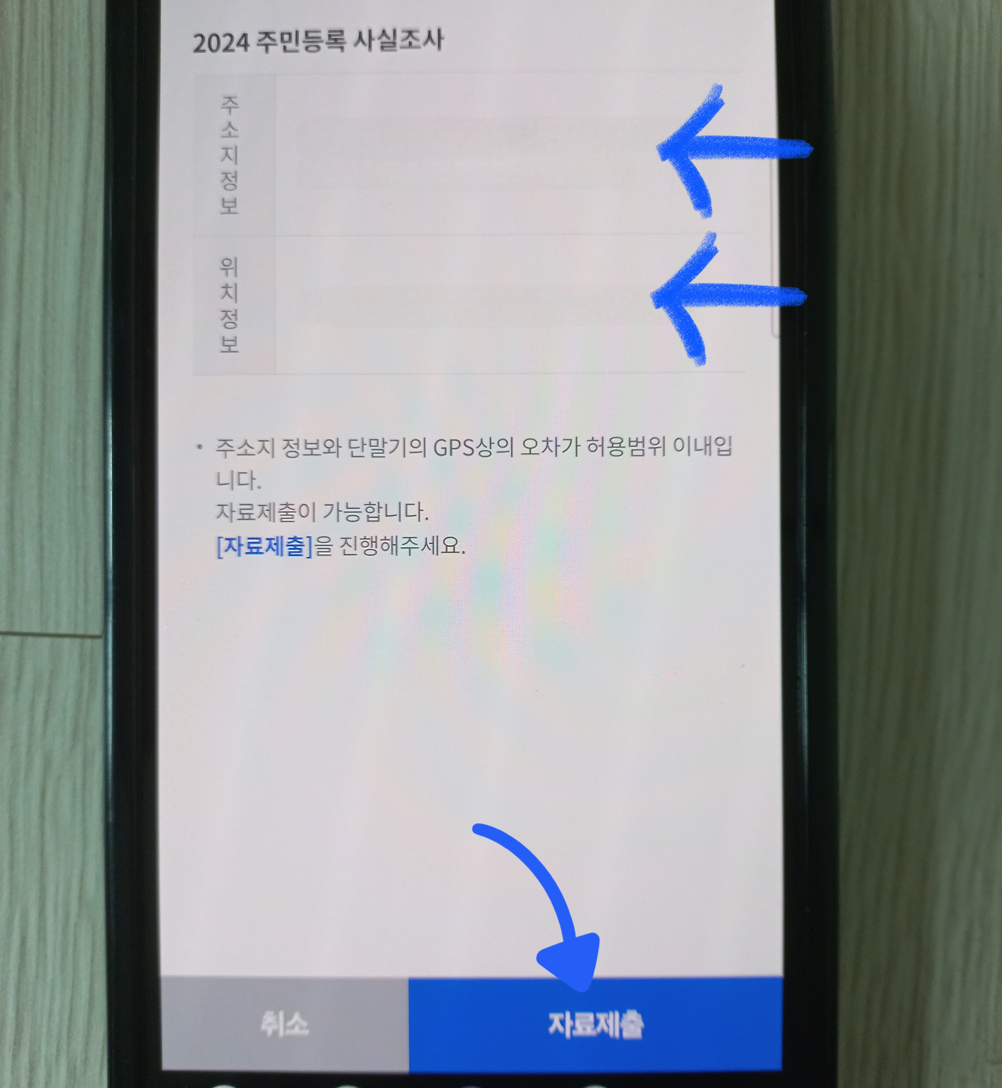 ▼전 다른 점이 없어 실제와 같음을 클릭 후 다음단계로 넘어갔는데요. 그럼 현재 위치정보를 확인한다고 뜨고 확인을 클릭하면 주소지정보랑 위치정보가 오차범위 안에 든다면 "자료제출"을 할 수 있답니다.
