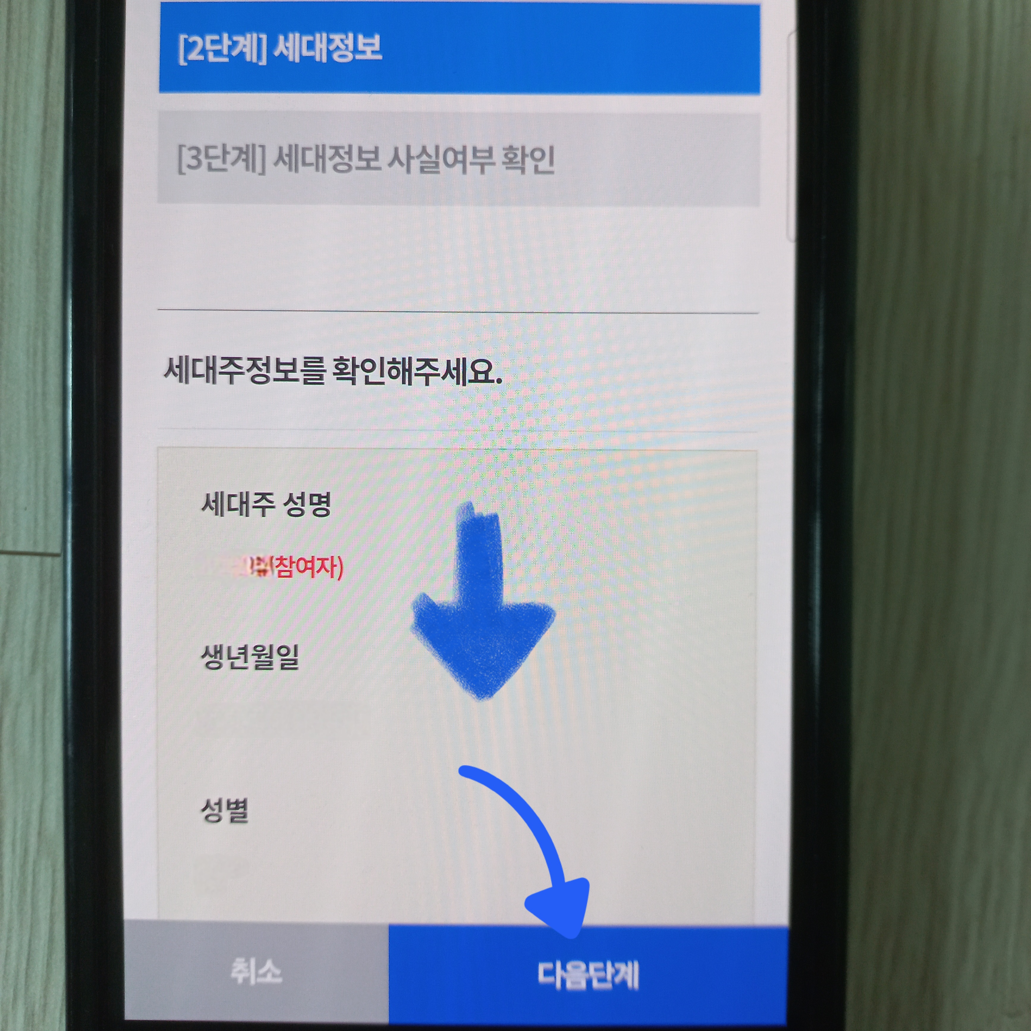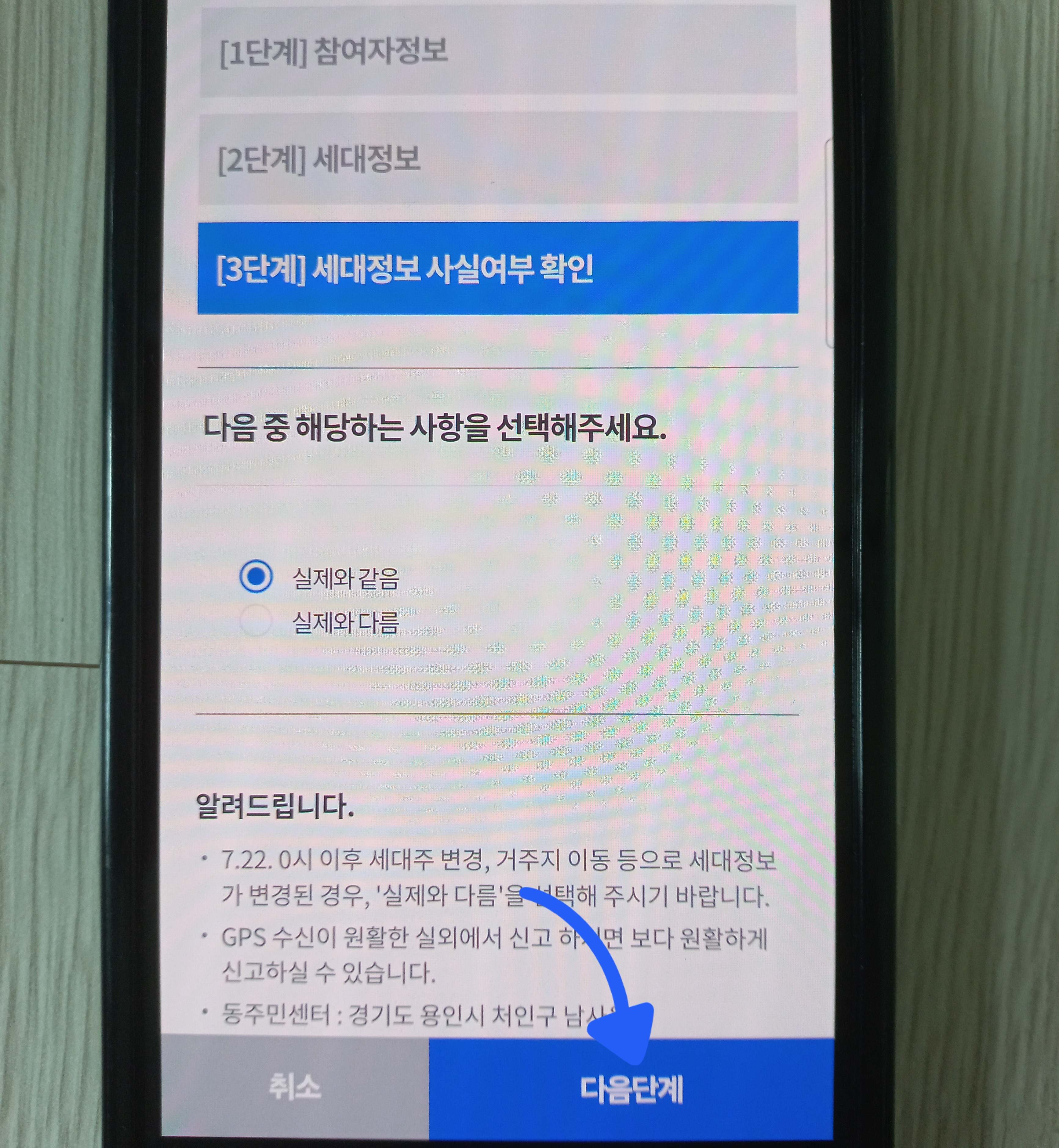 ▼3단계인 세대정보 사실여부 확인이 중요합니다. 만약 1, 2단계에서 다른 정보가 있다면 "실제와 다름"을 클릭해 주고 모든 정보가 다 맞다면 "실제와 같음"을 클릭 후 "다음단계"를 클릭해 주면 됩니다.