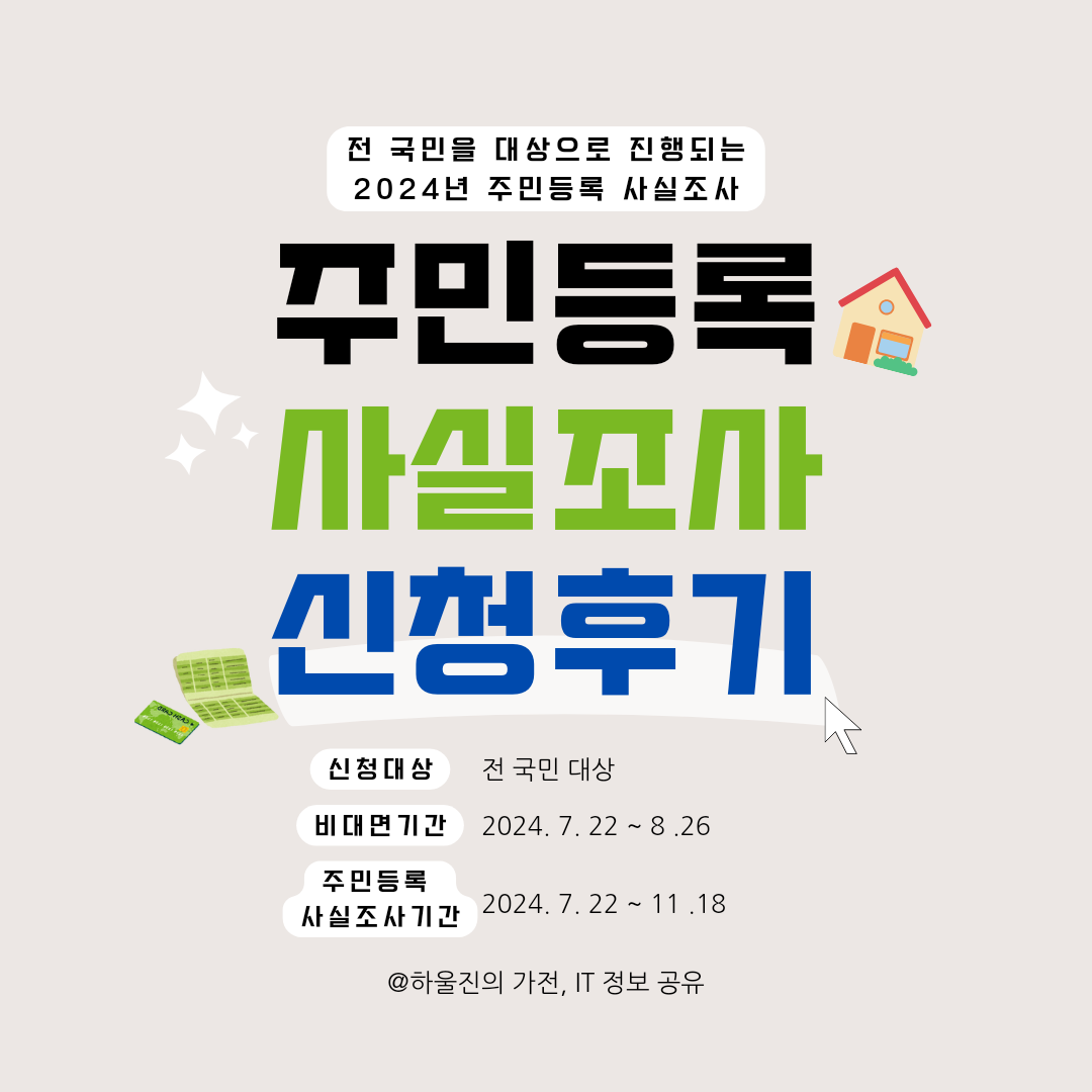2024.07.22 ~ 2024.11.18까지 전 국민 대상으로 주민등록 사실조사를 진행한다고 하는데요. 단 2024.07.22 ~ 2024.08.26까지 정부24앱으로 비대면 사실조사에 참여할 수 있다고 해 바로 참여해 보았습니다.