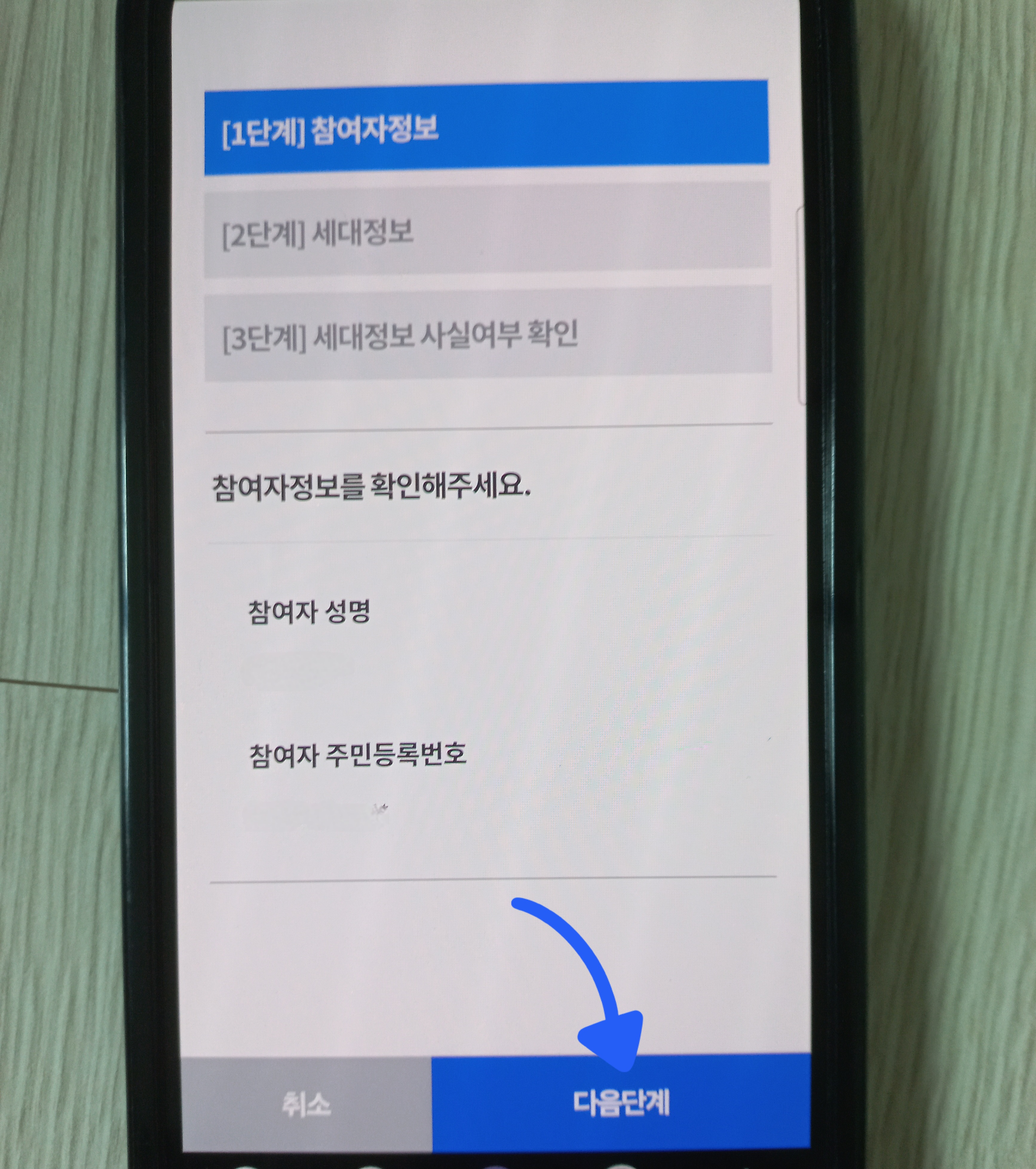 ▼참여자 정보 다음이 바로 세대 정보인데요. 스크롤을 밑으로 내리면 같이 살고 있는 사람 정보가 쭉 뜹니다. 일단 틀리든 맞든 [다음단계]를 클릭해 주면 됩니다.