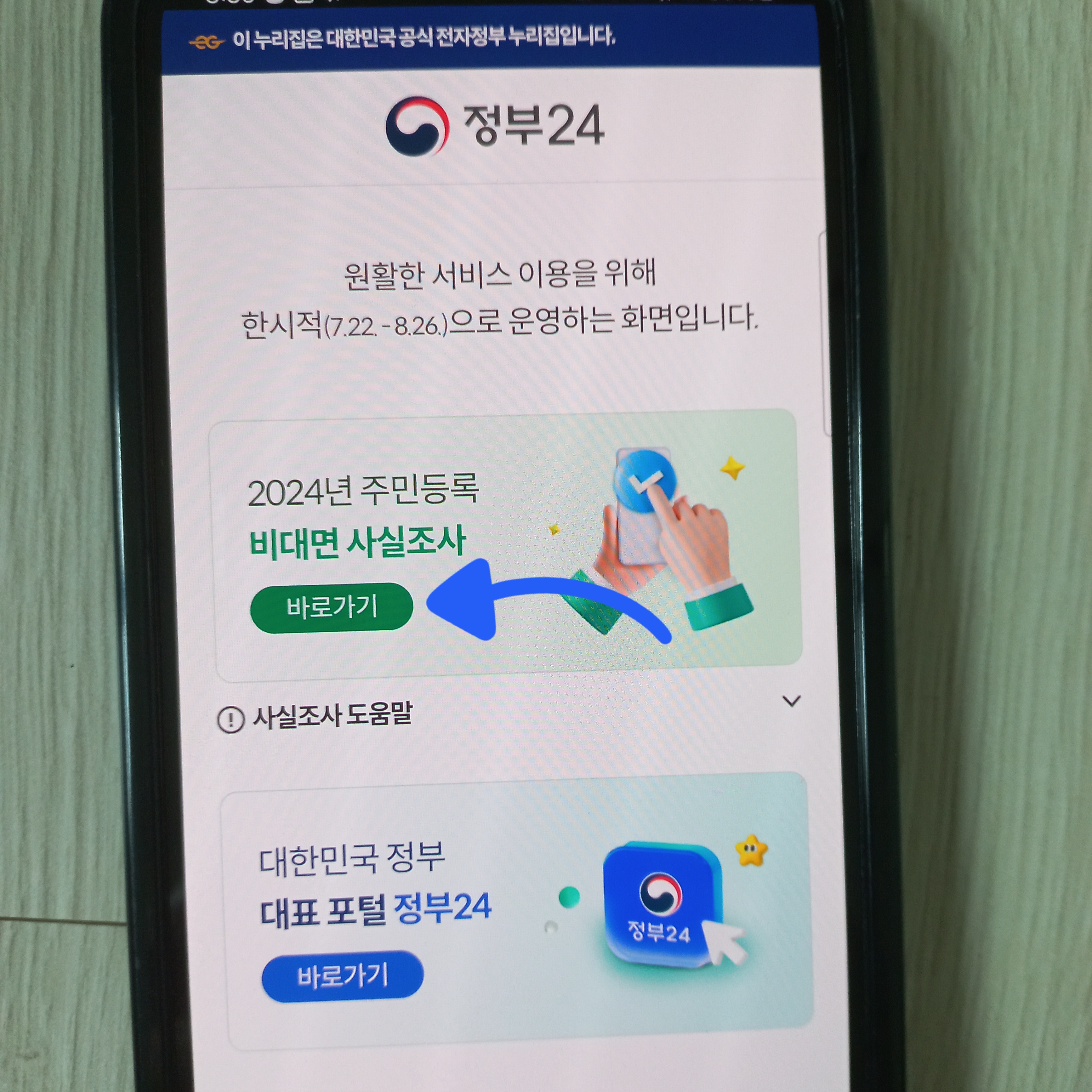 ▼정부24앱을 다운로드 후 정부24앱으로 들어가면 8월 26일까지 주민등록 비대면 사실조사 화면이 뜨는데요. 그럼 바로가기를 클릭 후 로그인을 해주면 됩니다.