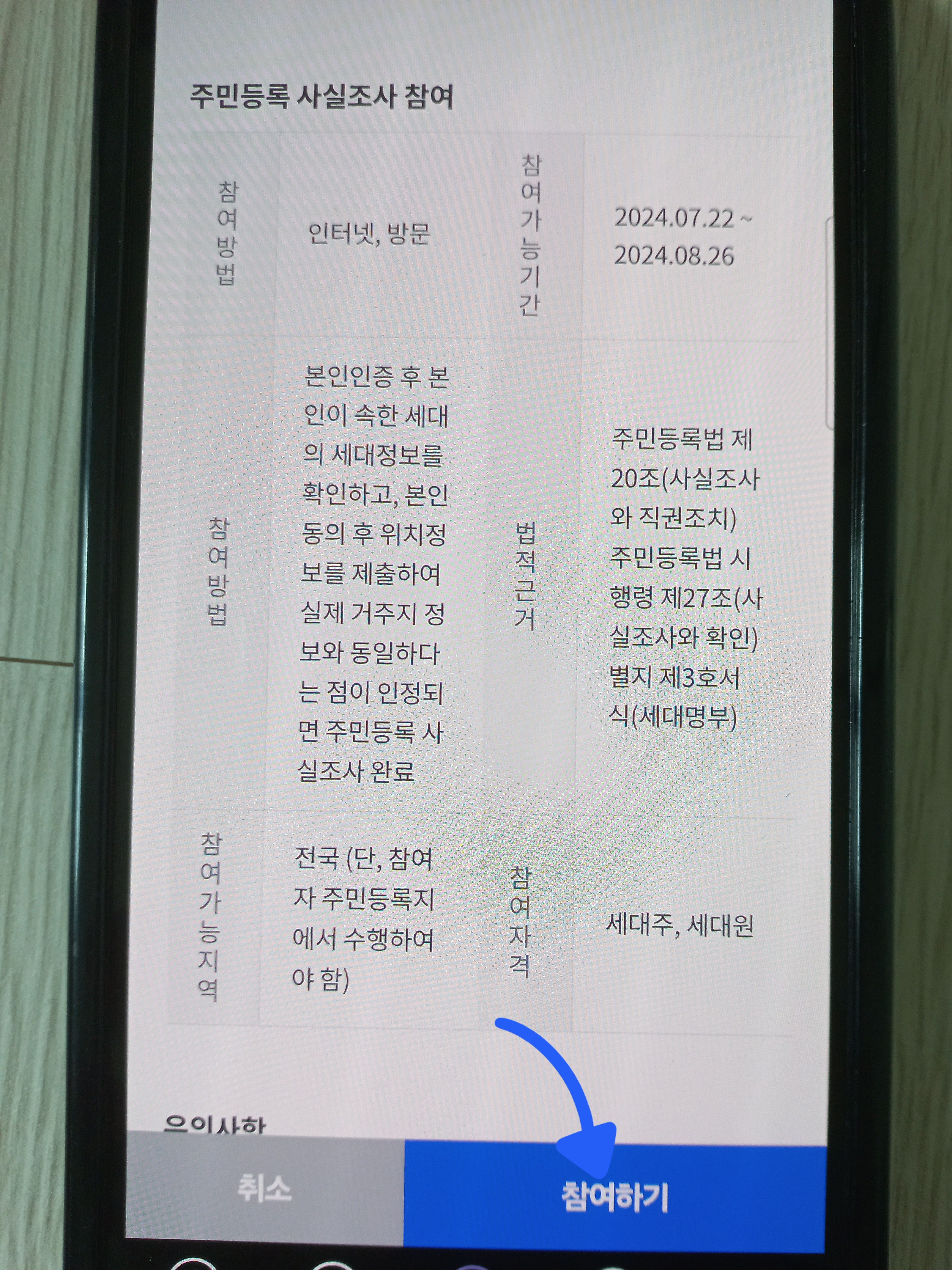 ▼그럼 주민등록 사실조사 참여에 대한 내용과 유의사항이 뜨는데 간단하게 한번 쭉 읽어보시고 [참여하기]를 클릭해 주세요.
