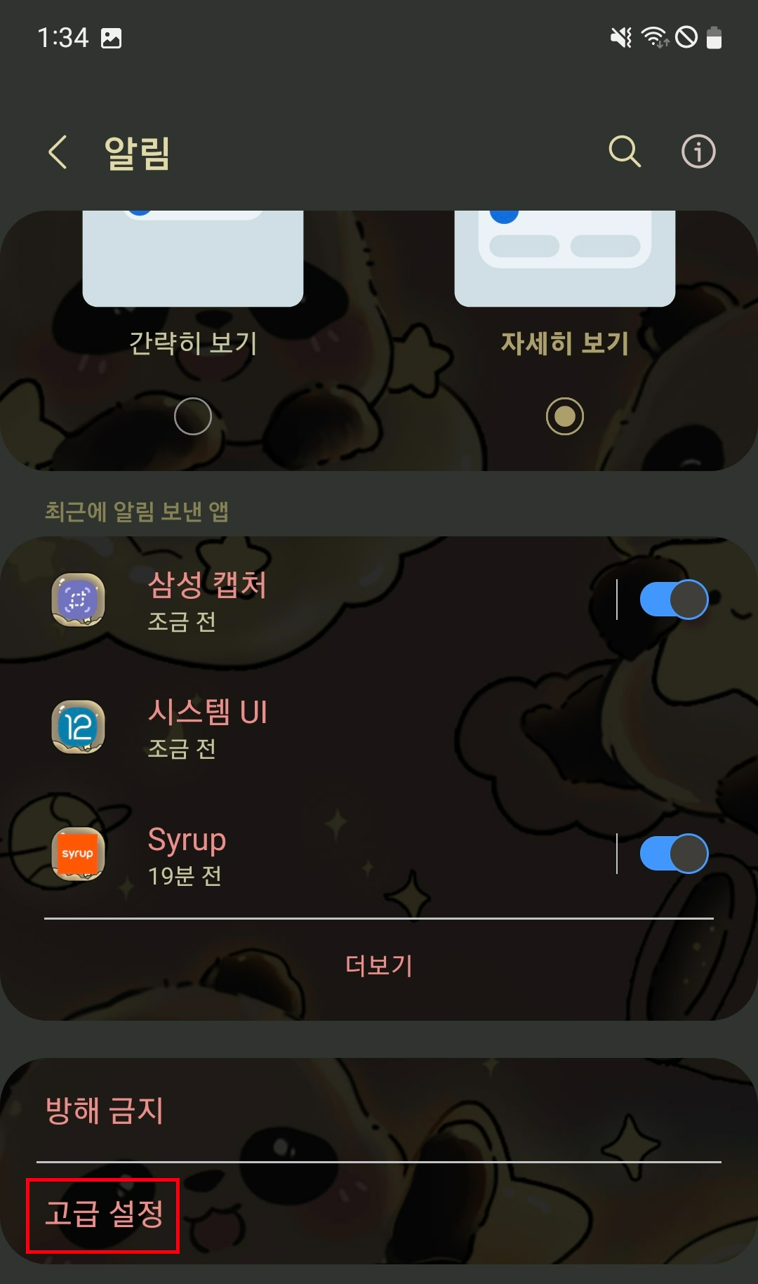 그다음 "알림(상태 표시줄. 방해 금지)"를 클릭하고 "고급 설정"을 클릭해줍니다.