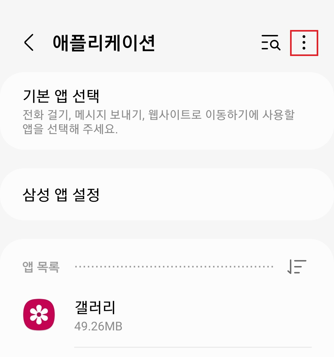 ▼두 번째 설정으로 갤럭시 스마트폰 일반[설정]에 들어가 [애플리케이션]를 클릭해준 다음 점 3개 [더보기]를 클릭해줍니다.