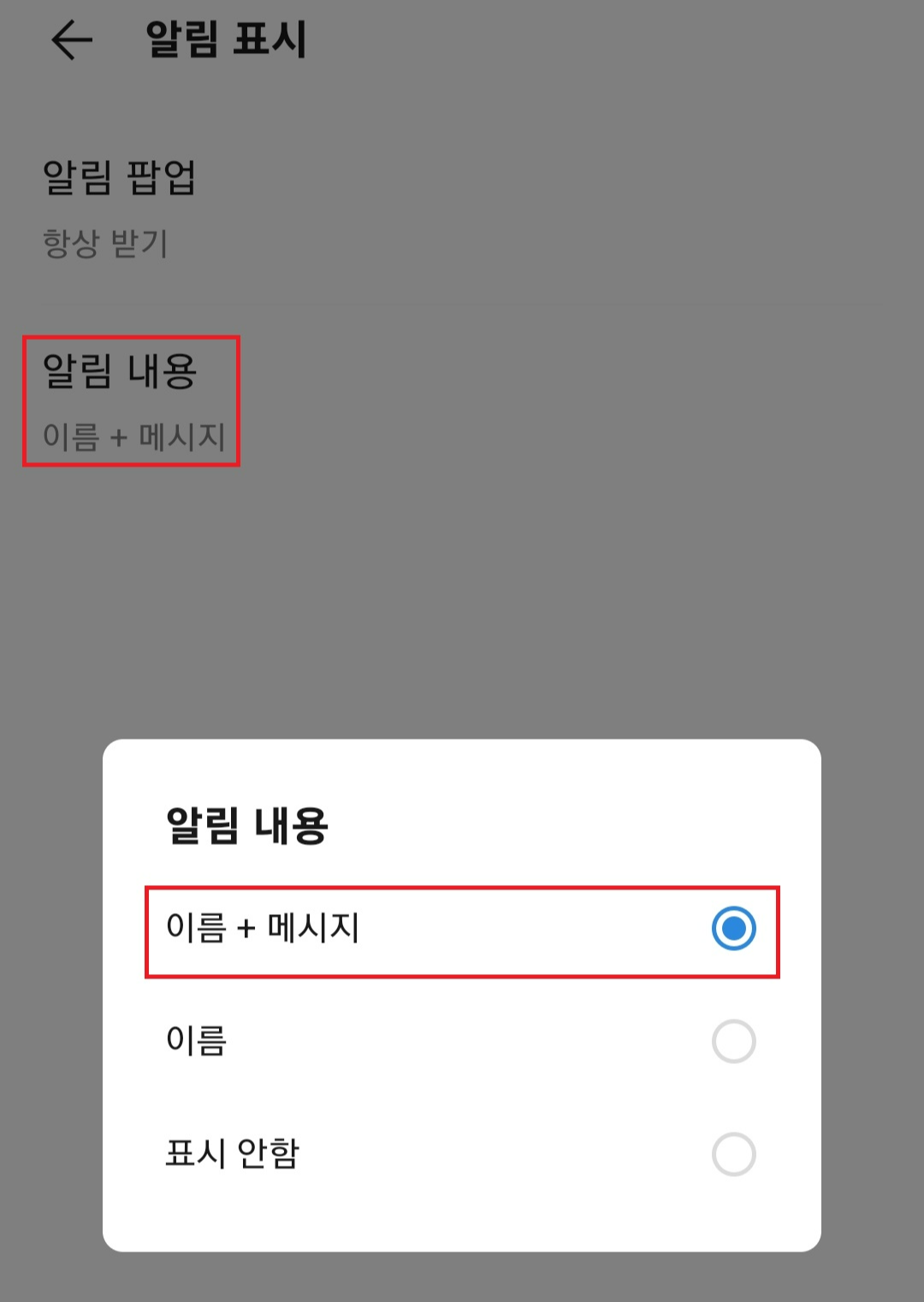 ▼마지막으로 [알림 내용]를 클릭 후 [이름 + 메시지]로 설정해주기만 하면 첫 번째 설정은 끝납니다.