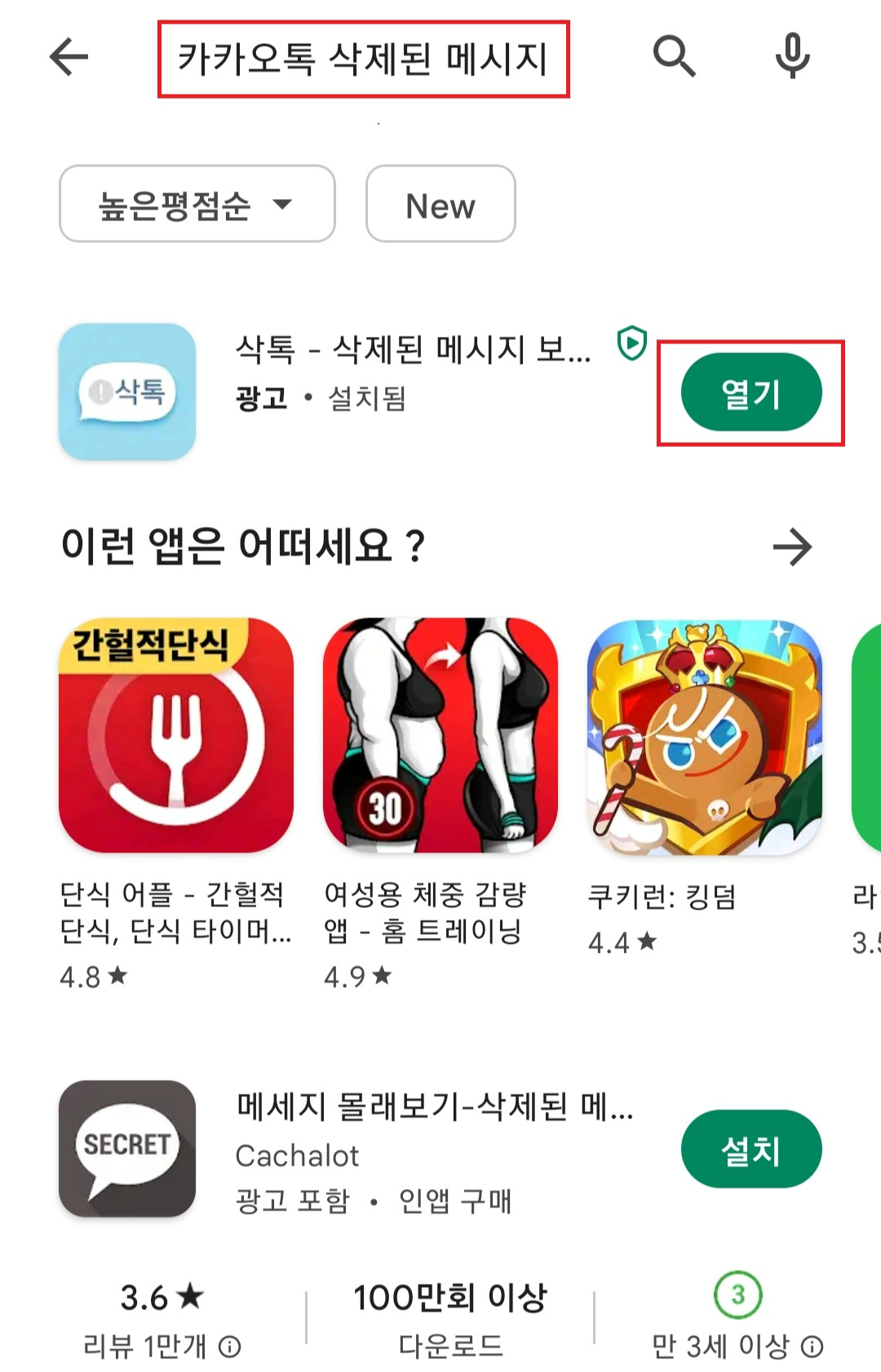 ▼카카오톡 삭제된 메시지를 확인하기 위해선 카카오톡 외에 어플을 하나 다운로드 받아하는데요. 우선 [Play 스토어]에서 [카카오톡 삭제된 메시지]를 검색하면 다양한 앱들이 뜨는데 그중 원하는 앱 하나는 선택 후 설치를 해줍니다. 저 같은 경우 [삭톡] 어플을 사용 중이라 삭톡 어플로 설명해드리지만 다른 어플을 설치받아도 설정 방법은 동일합니다.