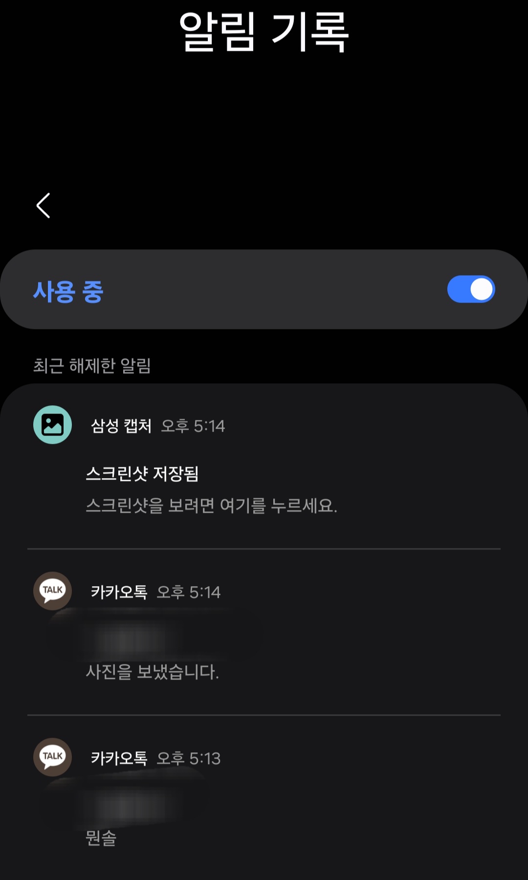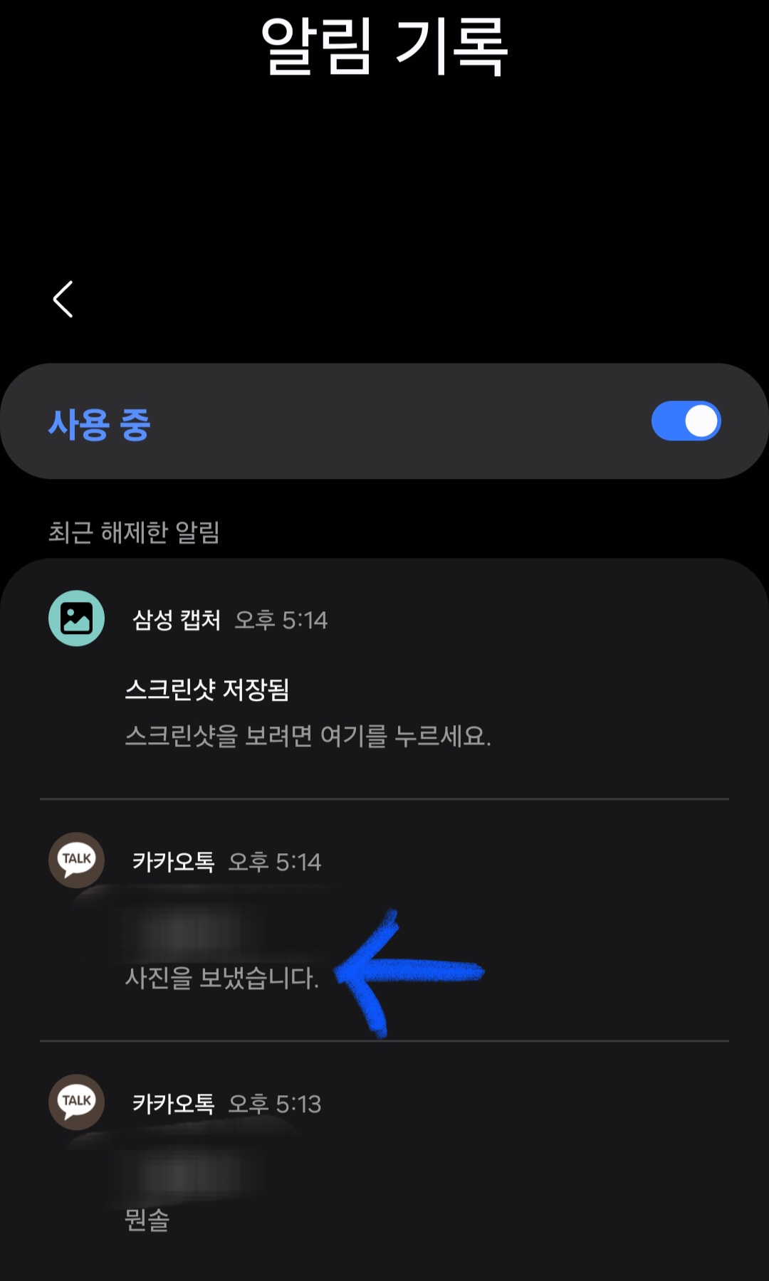 ▼그리고 두번째로 만약 카카오톡 알림 표시를 "이름+메시지"가 아닌 "이름"으로만 설정해 놓았다면 상대방이 삭제한 삭제된 메시지 또한 "새로운 메시지가 있습니다"로 저장되므로 확인할 수 없다는 점 참고 하시길 바랍니다.