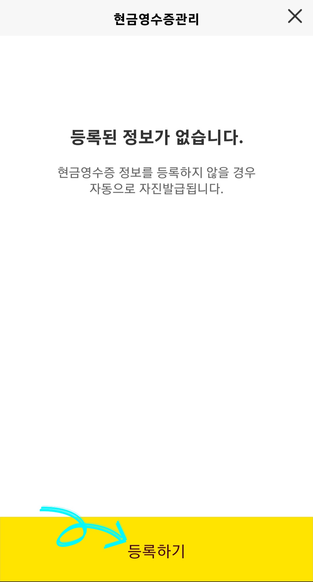 *현금영수증 정보를 등록하지 않을 경우 자동발급됩니다 라는 문구는 국세청 홈택스 사이트에 별도로 등록을 해야 한다는 얘기입니다