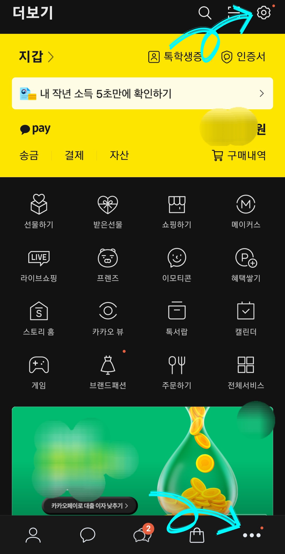 ▼일단 카카오톡을 실행해합니다 그다음 [더보기(•••)]를 클릭 후 [톱니바퀴모양]을 클릭해 줍니다