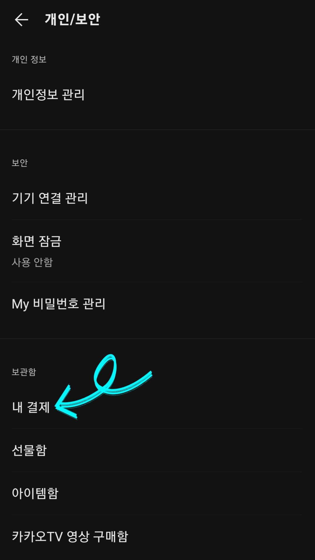 ▼그다음 [개인/보안]을 클릭하고 [내 결제]를 클릭해 주세요